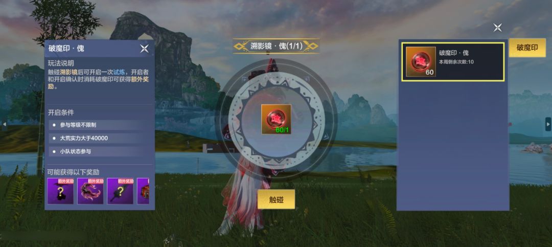 Tips:溯影镜根据难度需要不同的破魔印,一星(千年难度)需破魔印·傀,二星(万年-三万年难度)需破魔印煞,三星(五万年-八万年难度)需破魔印·魇。溯影镜虽然有难度,但是只需要一个破魔印即可开启,奖励还是按照小队人数分配的,所以比魔化巨兽性价比更高!当然,要注意队员也需要提交破魔印哦~
