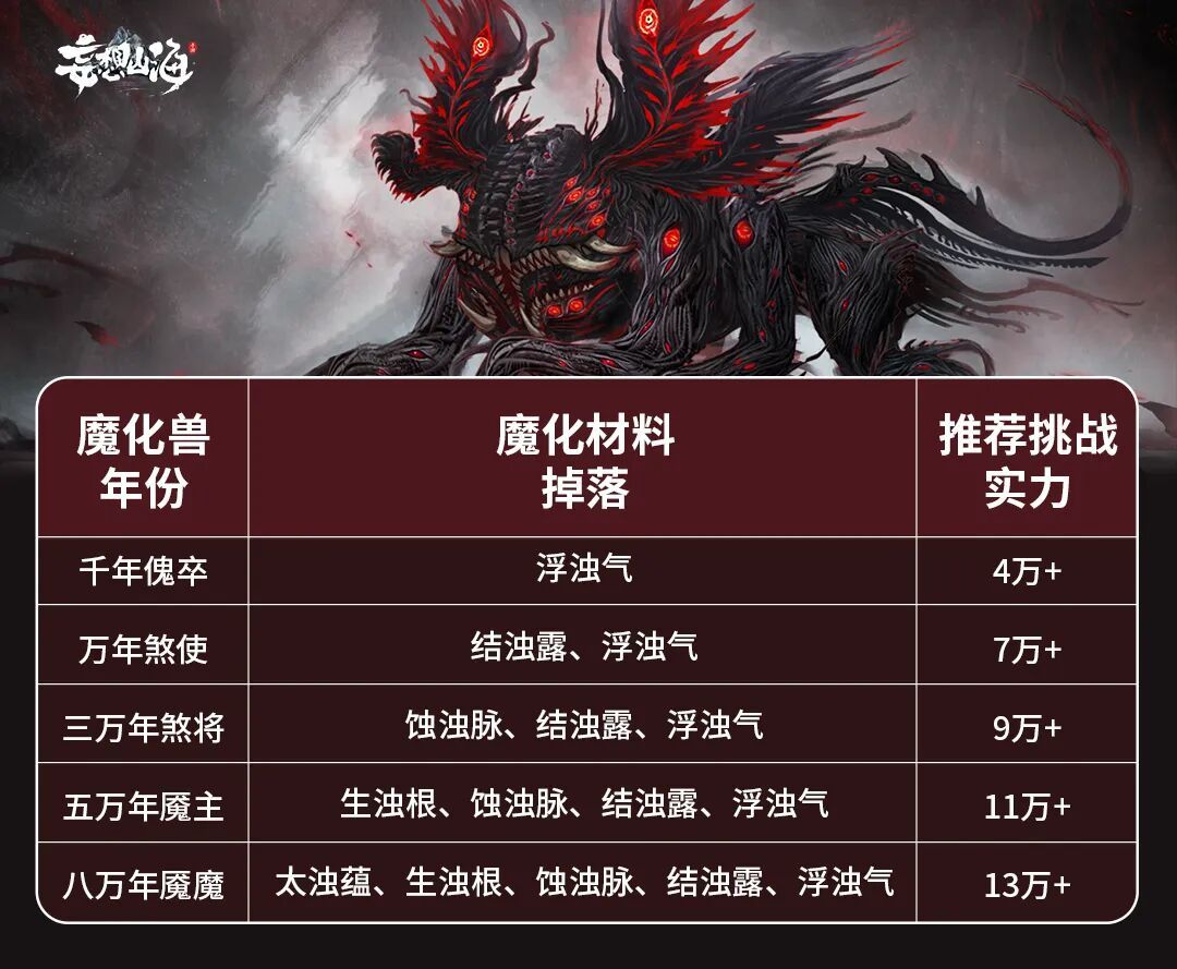 魔化兽,即受帝江浊气影响的巨兽,外形为原本形态的“黑化版本”,拥有原战斗技能,同时还具有魔化技能。