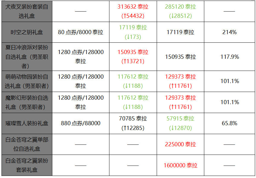 上周新上线的白金天空礼包价格非常高,大部分区服的价格都可以划到20万泰拉一件,后续再降价也不会降太多了,获取的难度不仅大,天空本身还是很保值的