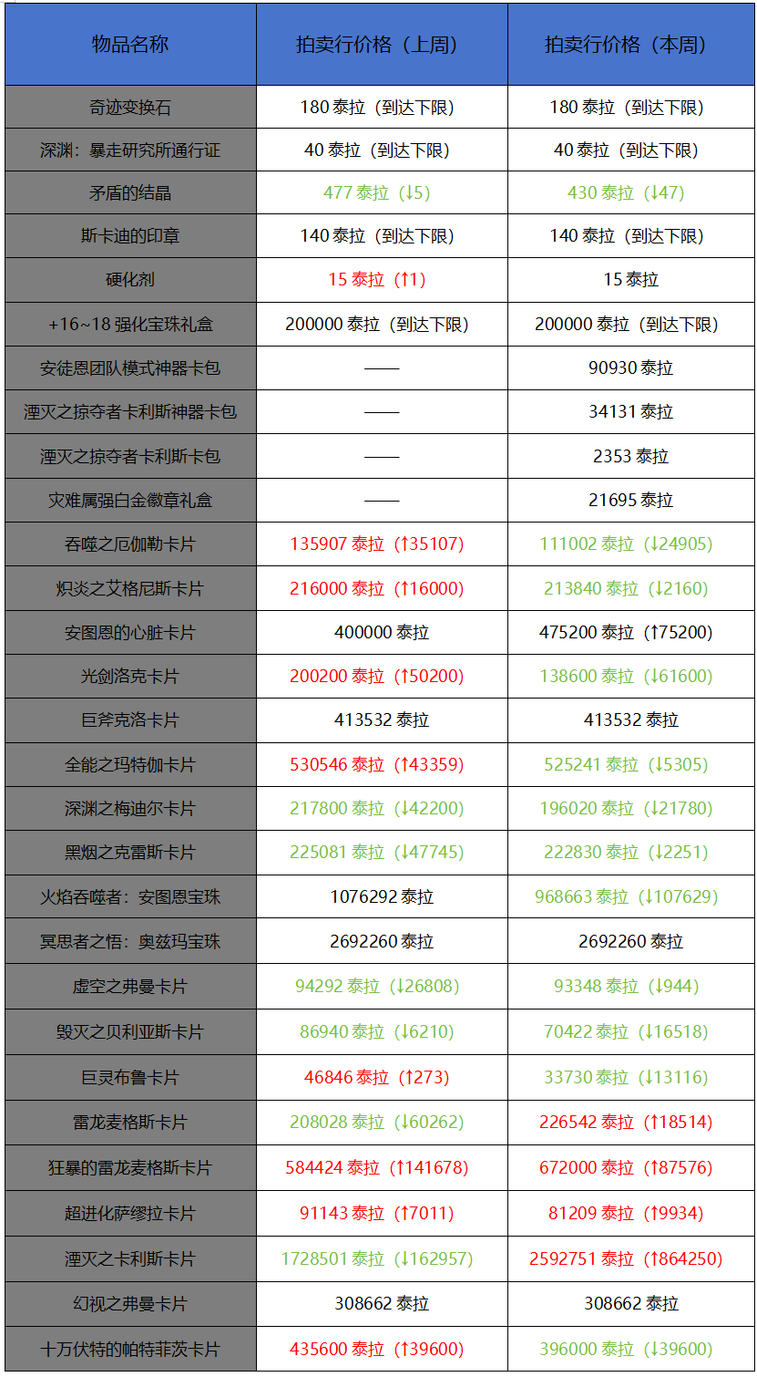 26年第一周的搬砖道具价格依旧惨不忍睹,满屏的绿字,包括矛盾在内,玩家能简单获得的大部分道具价格都出现了大幅度的降价,就连安徒恩宝珠的价格都降到了96万泰拉,这玩意真的有人在拍卖购买吗?都已经到26年了,安徒恩普通团本即将淘汰,这些竞拍附魔道具价格的起拍价依旧坚如磐石,硬卡着起拍价,来抬高道具的价值,希望后面困难竞拍能下调它们的起拍价