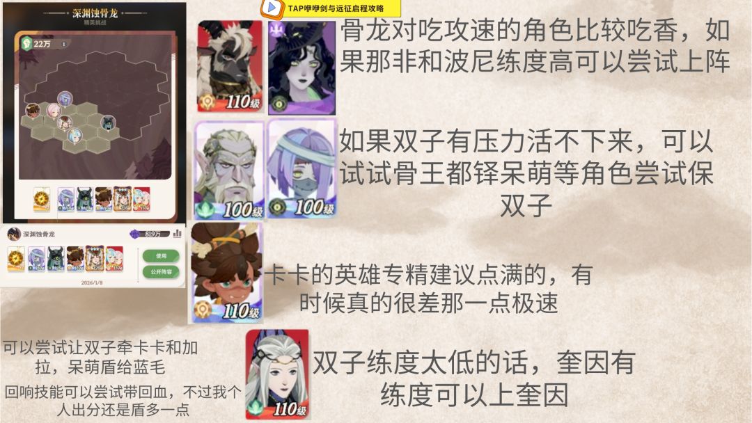 这里并不推荐上戴蒙,如果个人奎因练度足够的话还是要上奎因替代戴蒙的,奎因练度不够这里会被秒(当前测试下传说奎因110级,会被boss第二个技能秒),如果戴蒙练度不够可以尝试选择都铎。如果个人双子练度够的话,双子最好是替换下来卡卡,上卡卡的原因只有一个,有生存上的压力才会选择上卡卡。