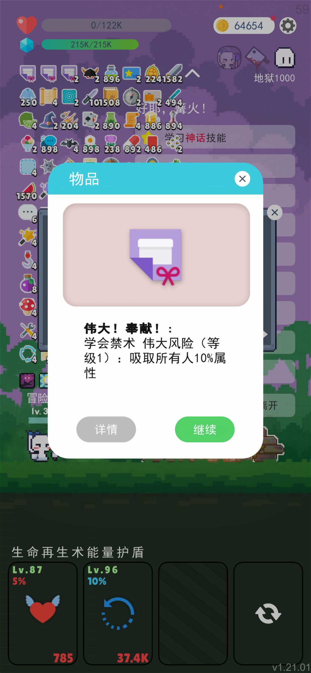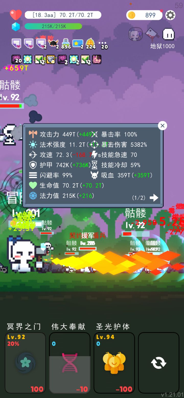 【伟大!奉献!】: 唯一真神,吸收敌人属性,敌人多强你就多强.像我打到1000层,吸收数值加成单位是aa,多到离谱.(没来得及截图)