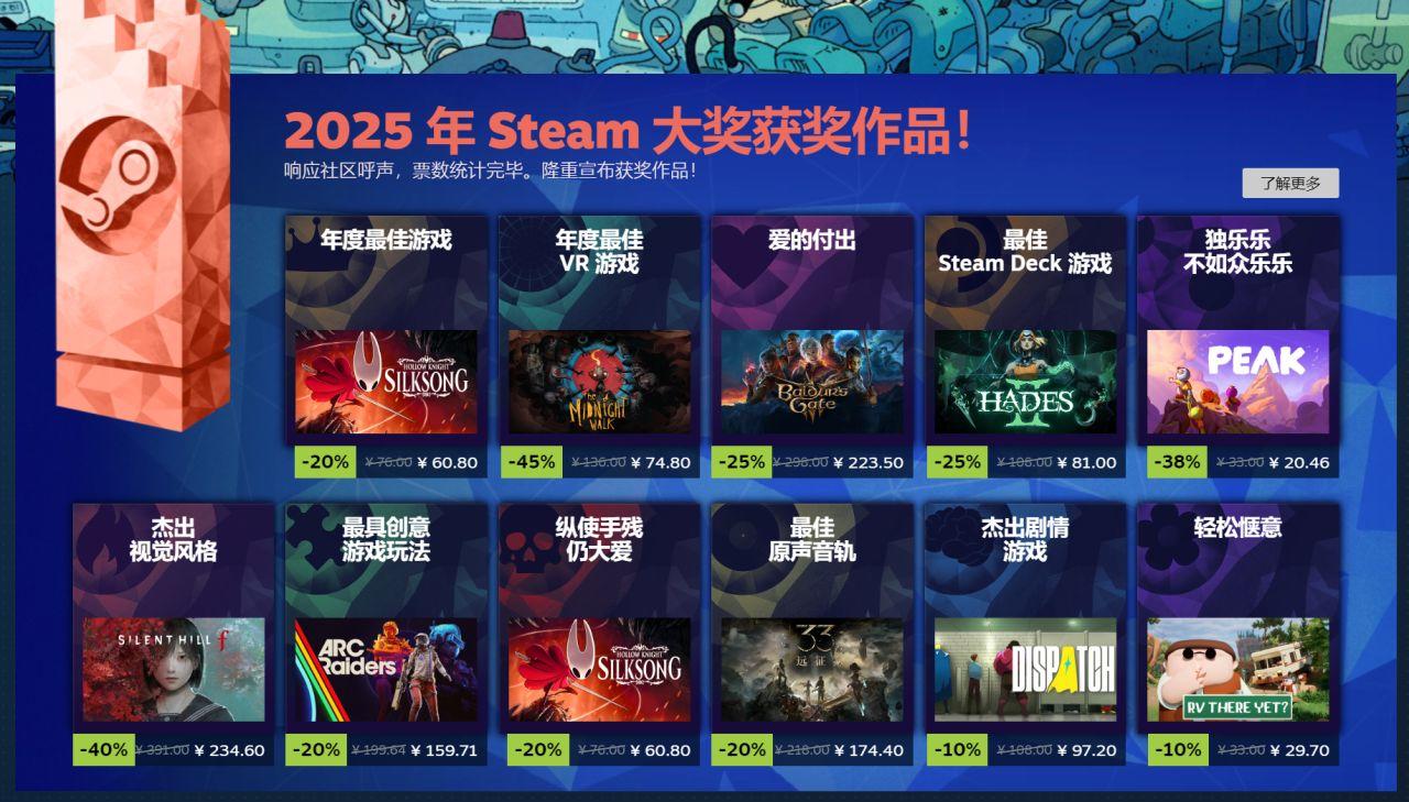 1月4日消息,2025年Steam大奖评选结果正式公布,《空洞骑士:丝之歌》斩获“年度最佳游戏”与“纵使手残仍大爱”两项大奖。