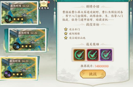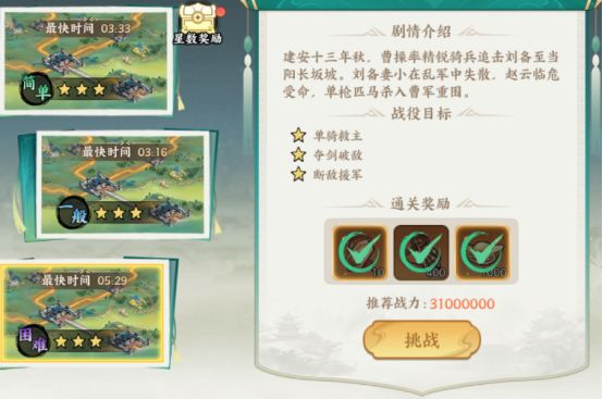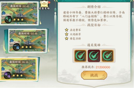 这章的难点在于支线衔接支线以及最终的守军人数较多,建议使用庞统、张绣等具有持续施技能力的技能增幅型武将快速击杀,配合周瑜、吕布这类具有范围杀伤能力的群伤型武将压血线。具有收割能力的关羽、孙策也是不错的人选。