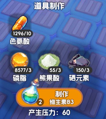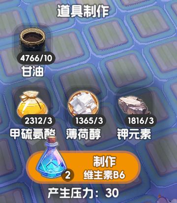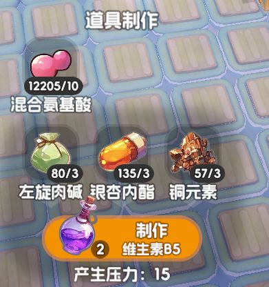 维生素B5带来15点压力,在三个维生素里面是最少的。但是生产速度实在太慢了我建议是可以给到5台以上的机子(我自己放了7台)。