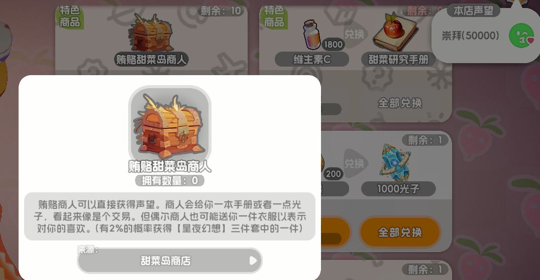 这里对商店我要补充一个方面:声望。 这个就很恶心了。 你要兑换猫娘碎片或者衣服的话就一定要到崇拜(50000)的声望等级。然而你把商店能买的买完了只能2万多、甜菜岛应该是3万,剩下的你只能靠着用对应的B5、B6、B3去换那10个感受体。(最近就有人问我,造蜜月结晶、造最终材料要用到维生素好多呀,这里我一定要提醒一下,必须先把维生素拿去把商店里的感受体换满,最终材料蜜月结晶这些不急,但是声望一定要拉满)想快速换到猫娘碎片就必须去买贿赂XX岛的商人,买10个一次就有5000的声望,不买箱子的话光光靠兑换感受体不知道得要多久。