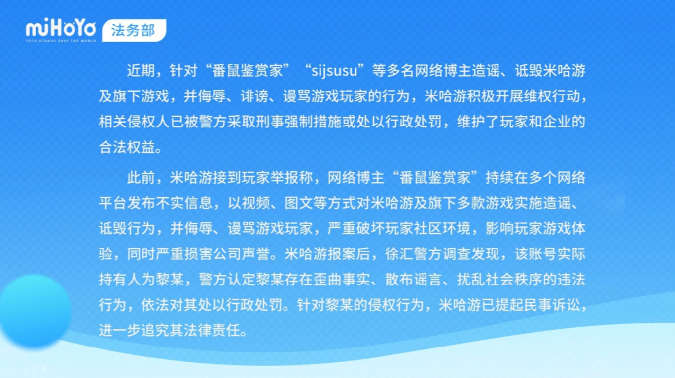 近期,米哈游针对“番鼠鉴赏家”“sijsusu”等多名网络博主的侵权行为展开集中维权,相关处理结果正式披露,引发游戏圈关注。这些博主通过视频、图文等形式,持续造谣诋毁米哈游及旗下游戏,还对玩家进行侮辱、诽谤与谩骂,严重破坏社区环境。
