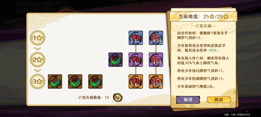 墨海渊毒阵容,不怕锁牌,少年攻击防御牌增加怒气,洗牌限制,反伤,污染牌库等负面影响,灾祸选择范围广泛,上图为示例。