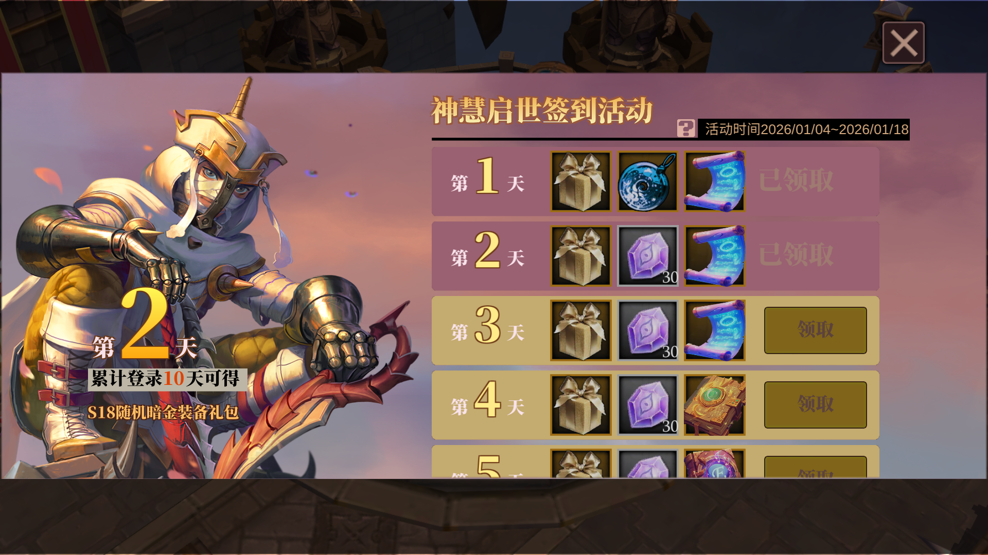 神慧启世版本签到开启,累计签到将获得祈愿结晶、S18随机暗金装备、职业UP祈愿开启凭证等。