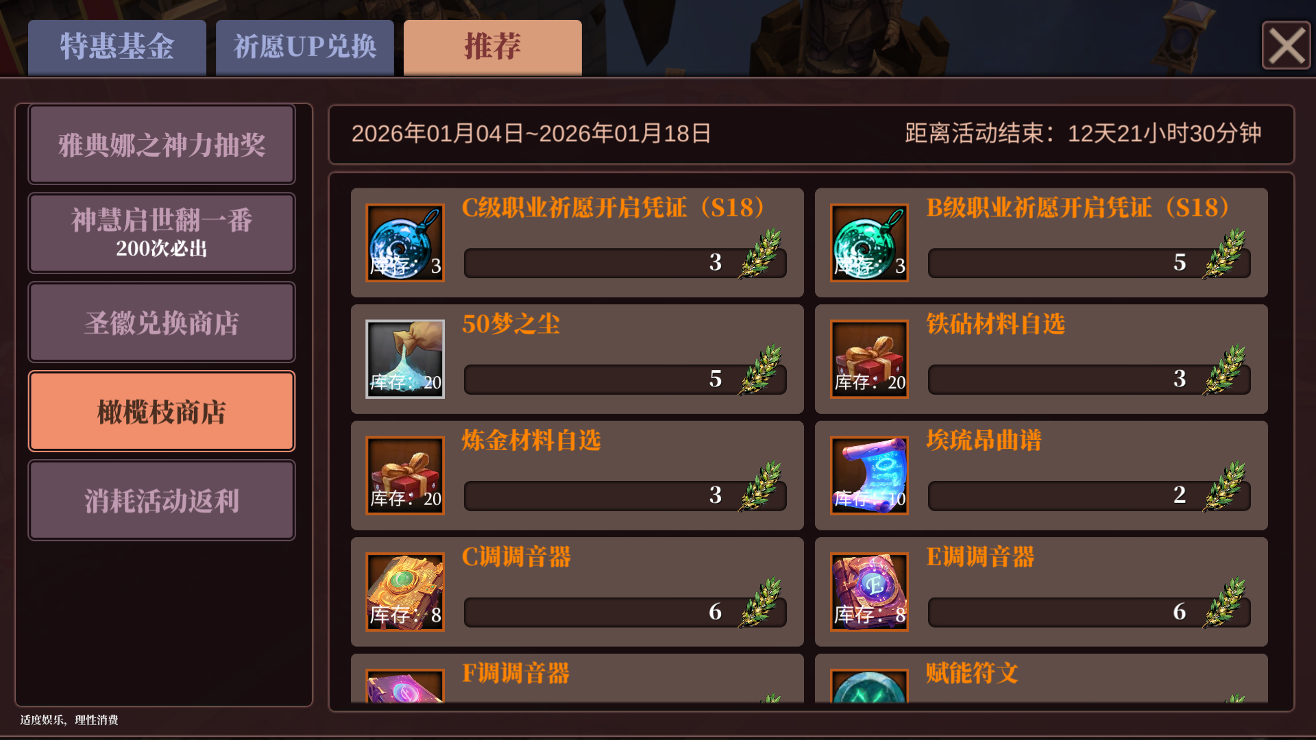橄榄枝消耗返利同步开启,累计消耗即可获得路线祈愿券、魔渊币、垓伊斯圣物等。