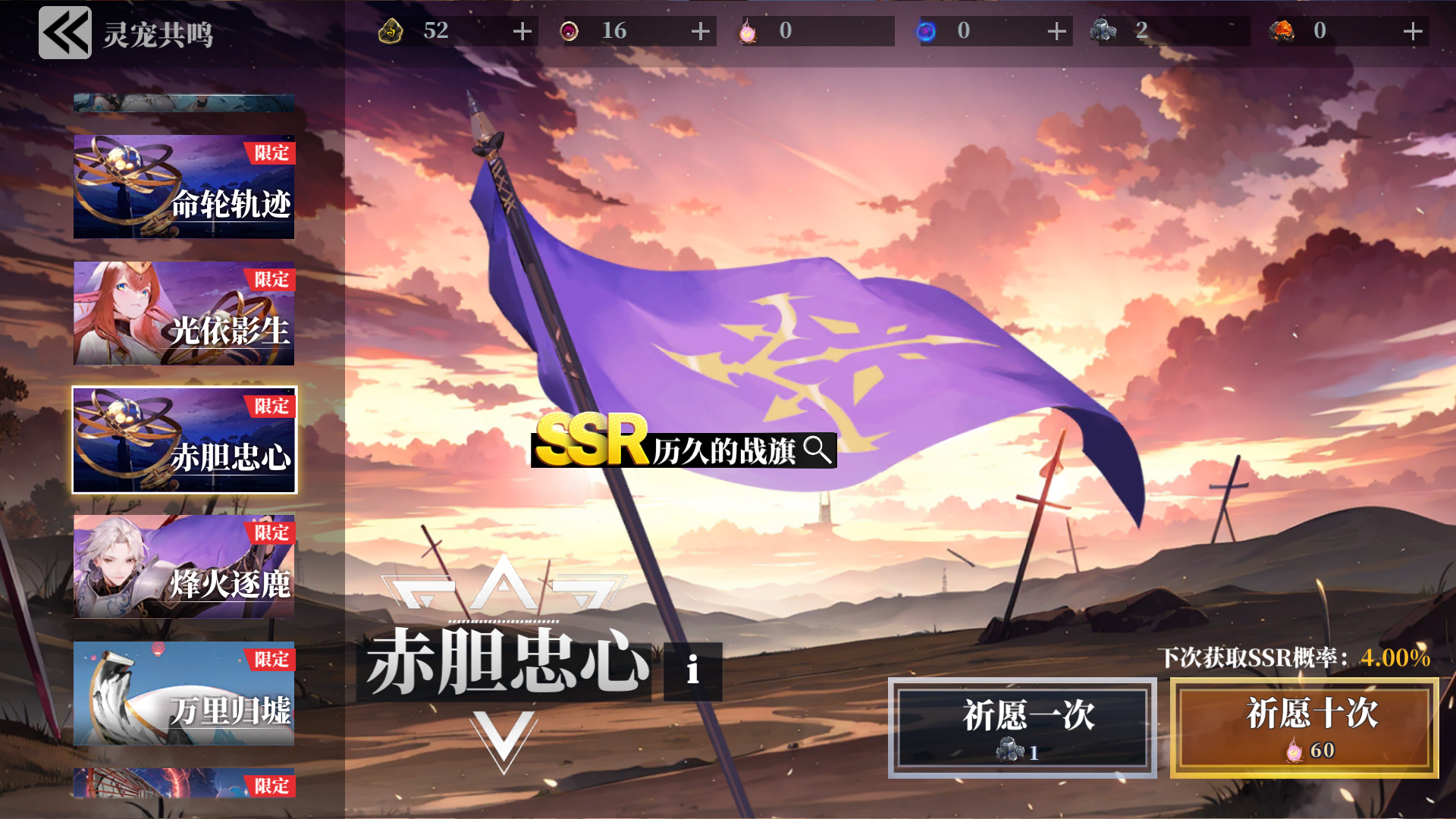 本期祈愿池的伴灵是——塞巴斯,伴灵共鸣【烽火逐鹿】开启,专武共鸣【赤胆忠心】上线。
