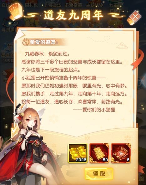 小狐狸的谢意却不会迟到,游戏内的感谢信已悄悄送到——里面装着2026元宝,象征我们在九周年之际共同踏入了2026年。别忘了登录收下这份心意,这是为九周年点燃的烛火,也是为十周年埋下的约定。