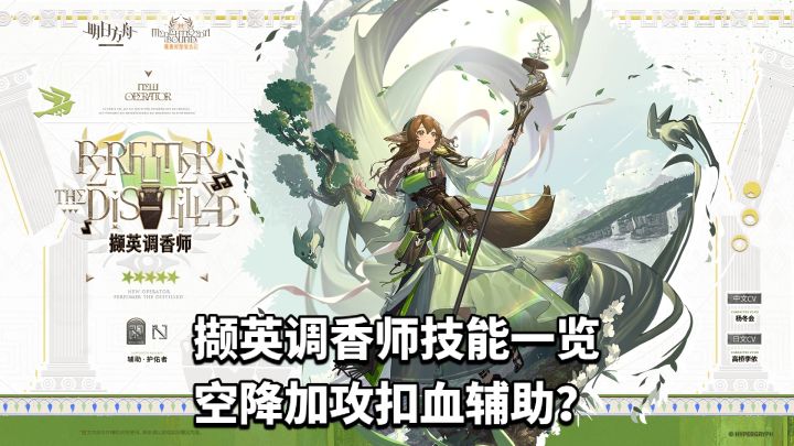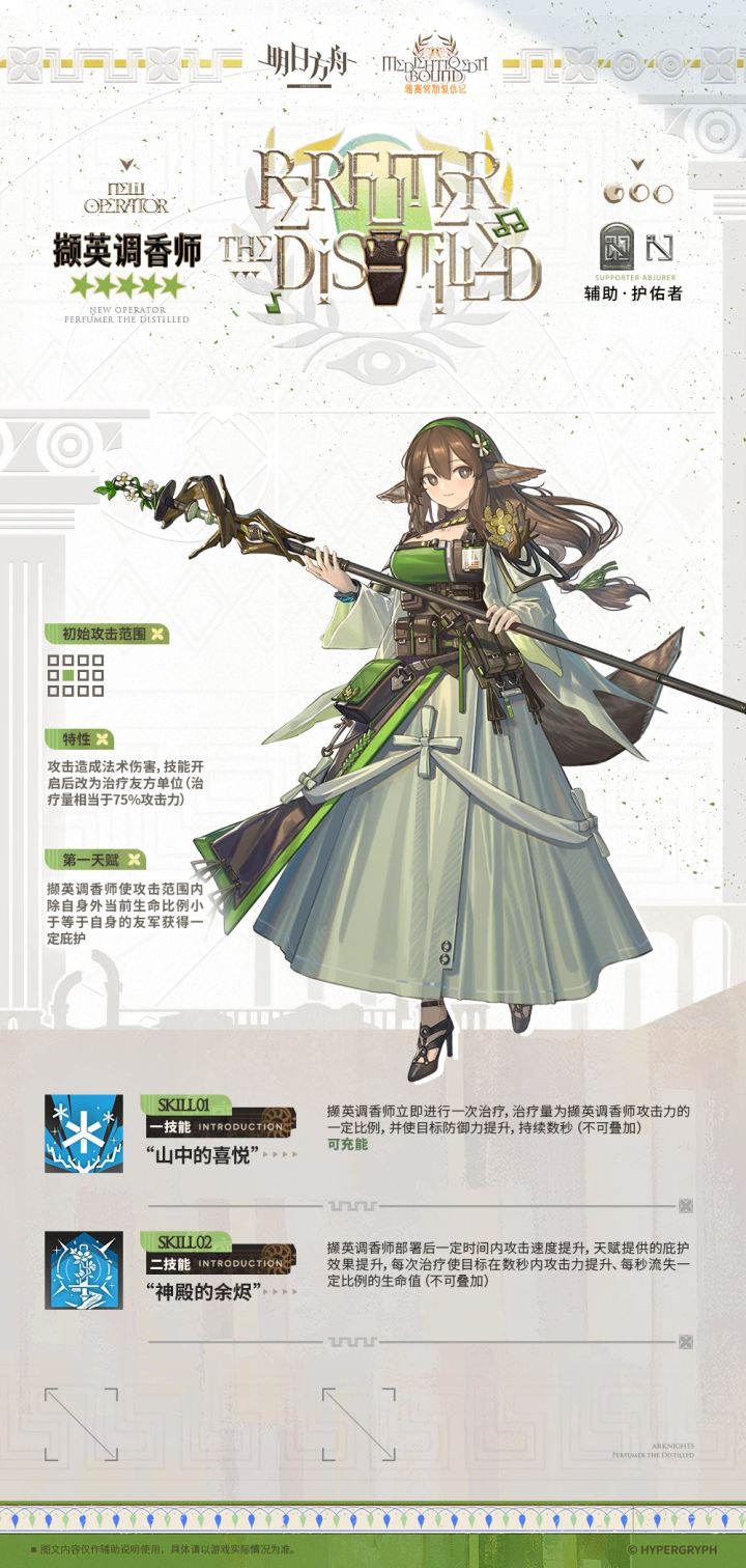 二技能“神殿的余烬”:撷英调香师部署后一定时间内攻击速度提升,天赋提供的庇护效果提升,每次治疗使目标在数秒内攻击力提升、每秒流失一定比例的生命值(不可叠加)