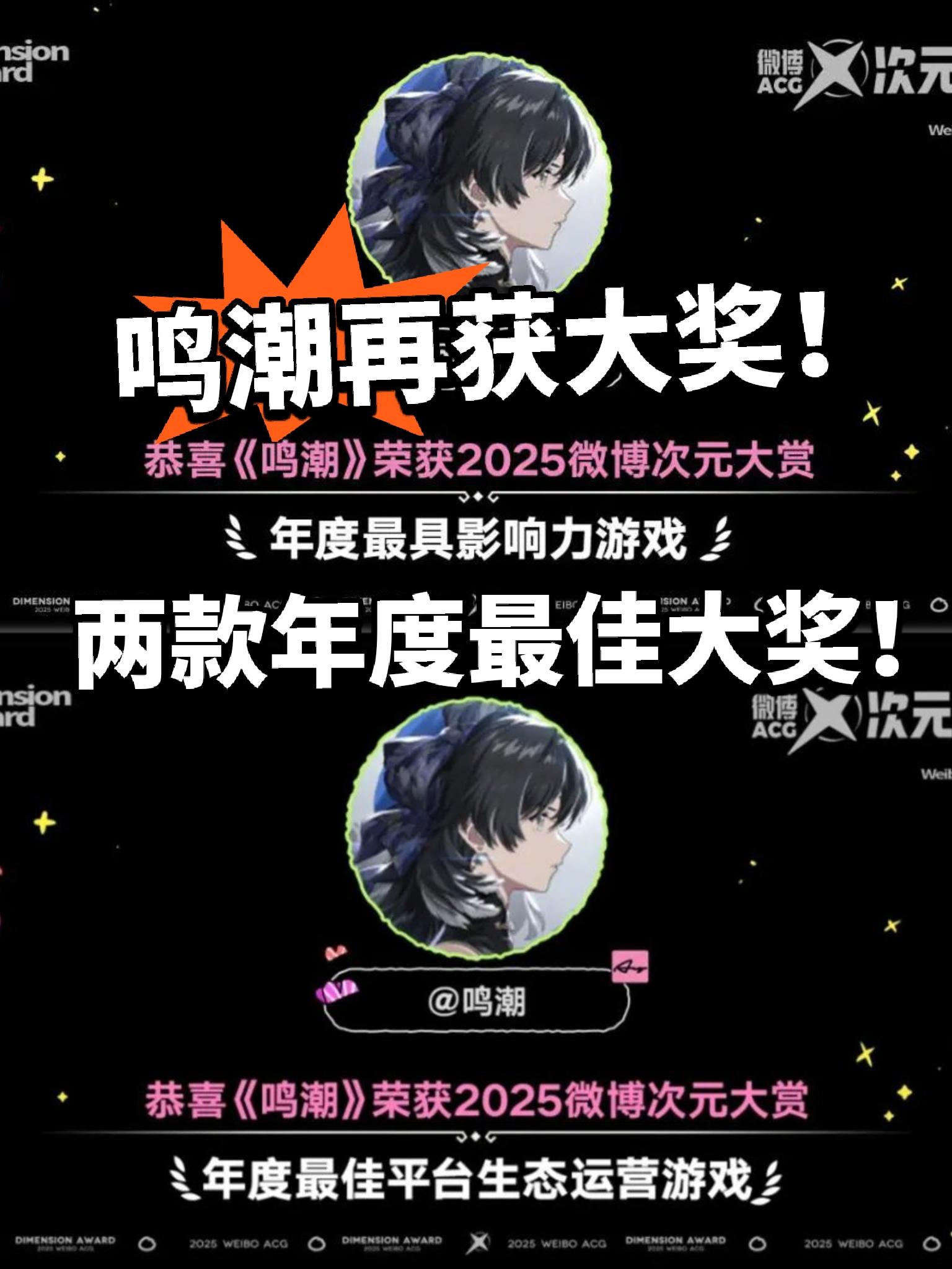 大的来了家人们!鸣潮今年真是拿奖拿到手软,这回又在2025微博次元大赏里,一举拿下了年度最具影响力游戏、年度最佳平台生态运营游戏两个奖项。