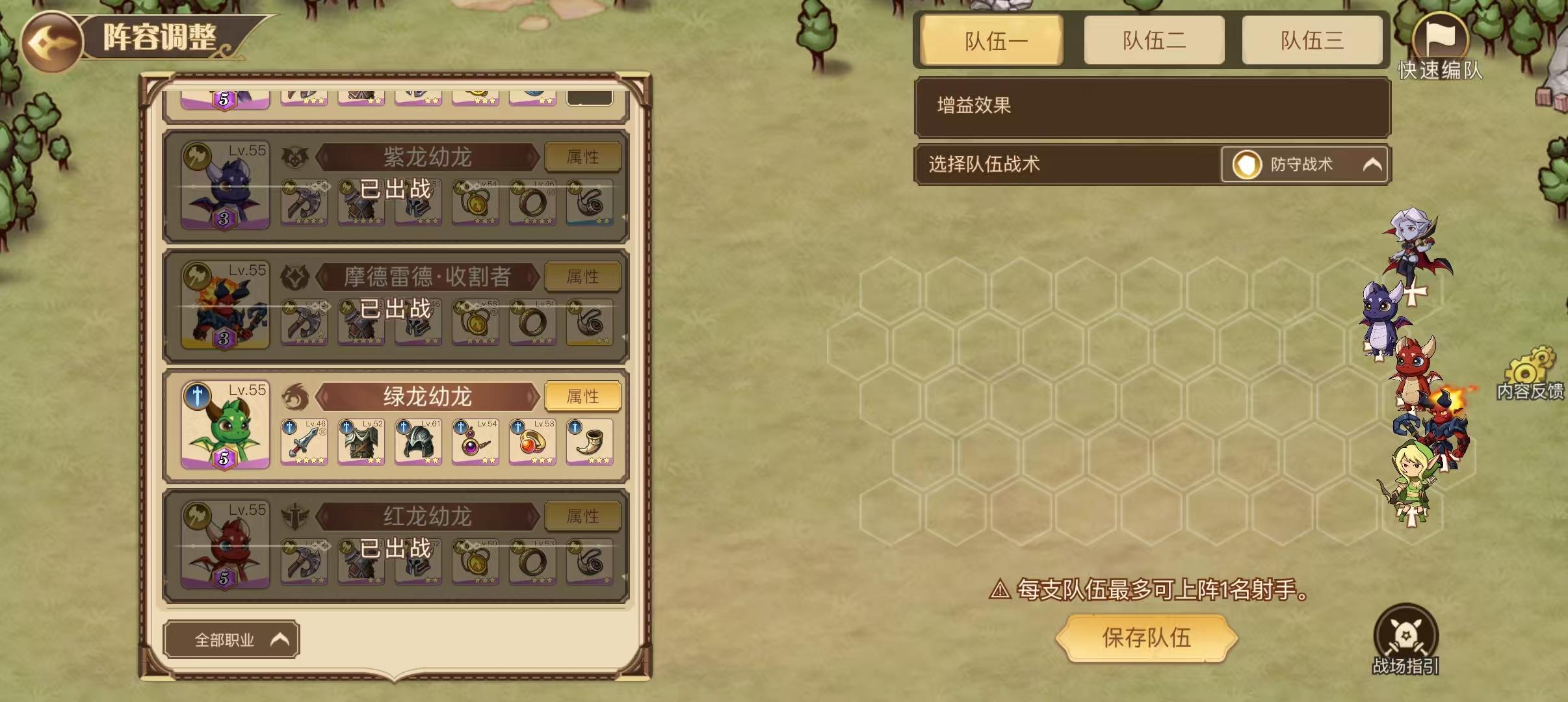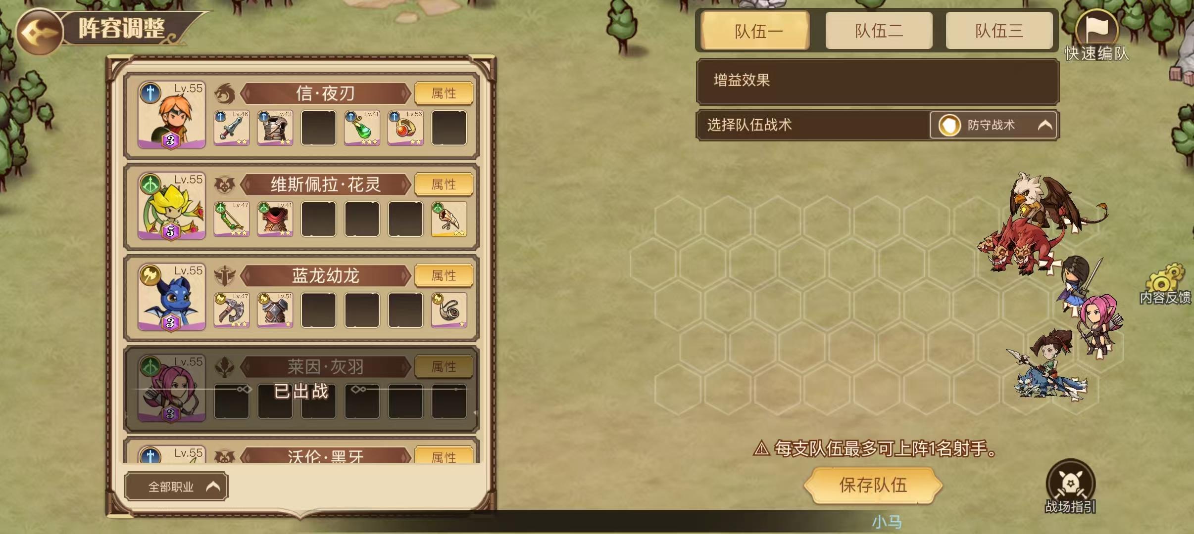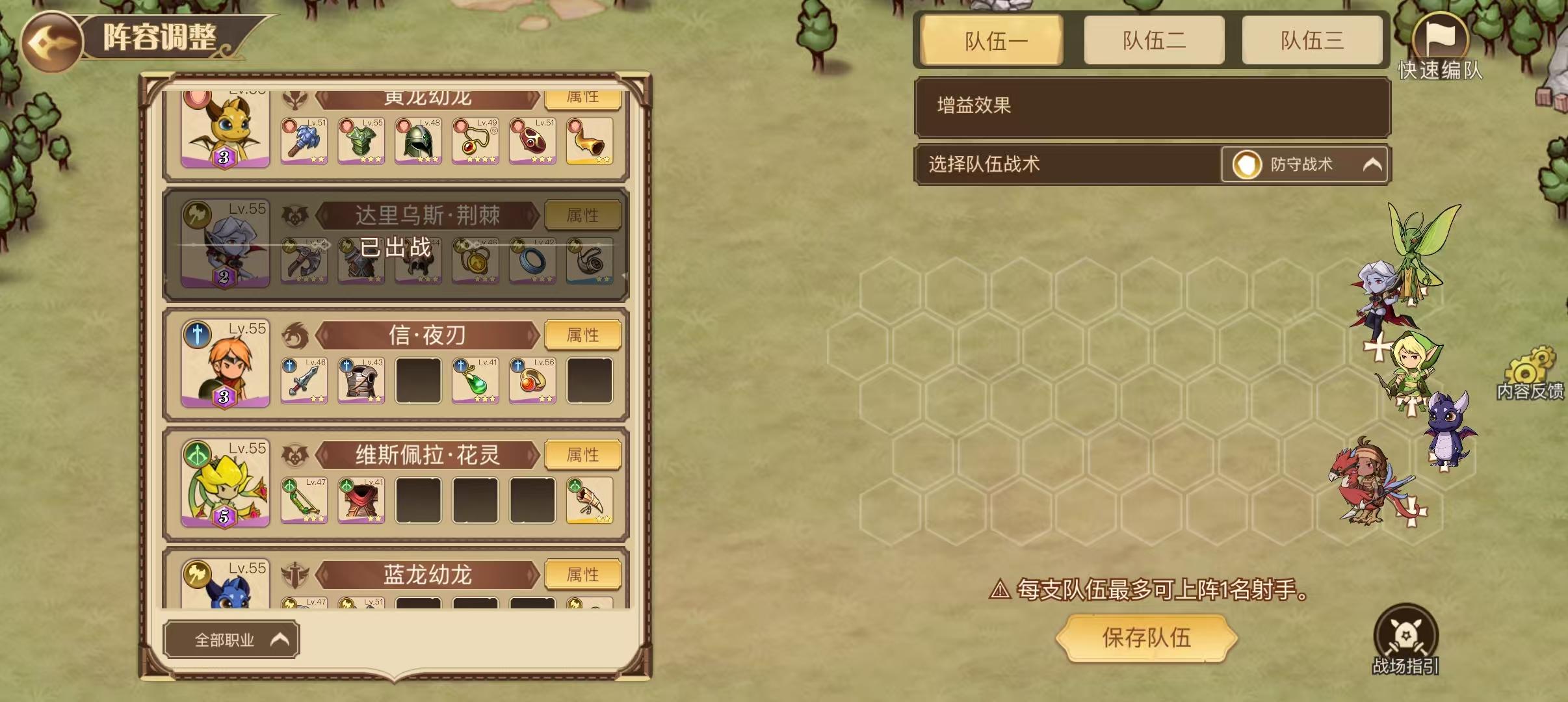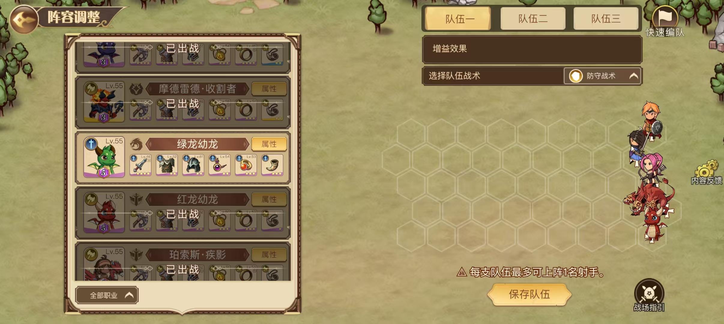 此站位射手4和5号位置都可以,狮鹫一定要贴着,留一个卡位,绿龙6速长腿可以根据情况考虑是否卡位打防守,伊薇和夜刃作为解围和集火手,适当布局位置往下或者往前压制