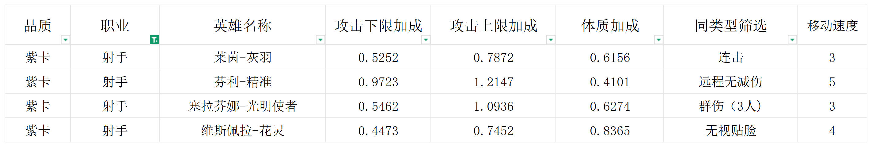 大家好,我是小萌新--偷腥的牧羊人,今天这期为大家讲一下紫卡射手,目前总共有4位,获取程度基本上也都比较简单,相信大部分常驻玩家已经拥有,不啰嗦正片开始