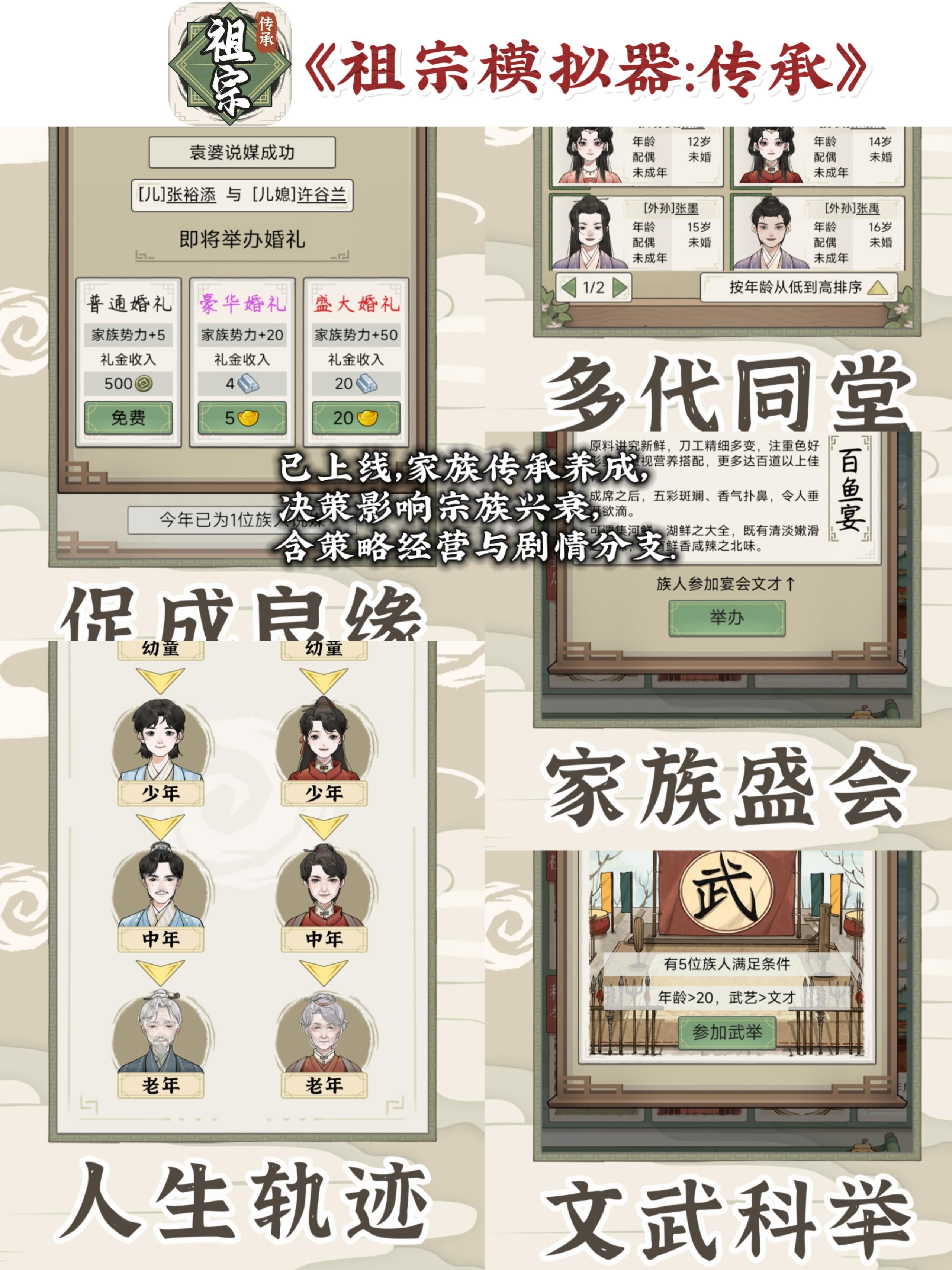 1.《祖宗模拟器:传承》(已上线):掌宗族兴衰,每步决策牵系世代命运,策略经营交织分支剧情,沉浸式体验家族传承的厚重与智慧。