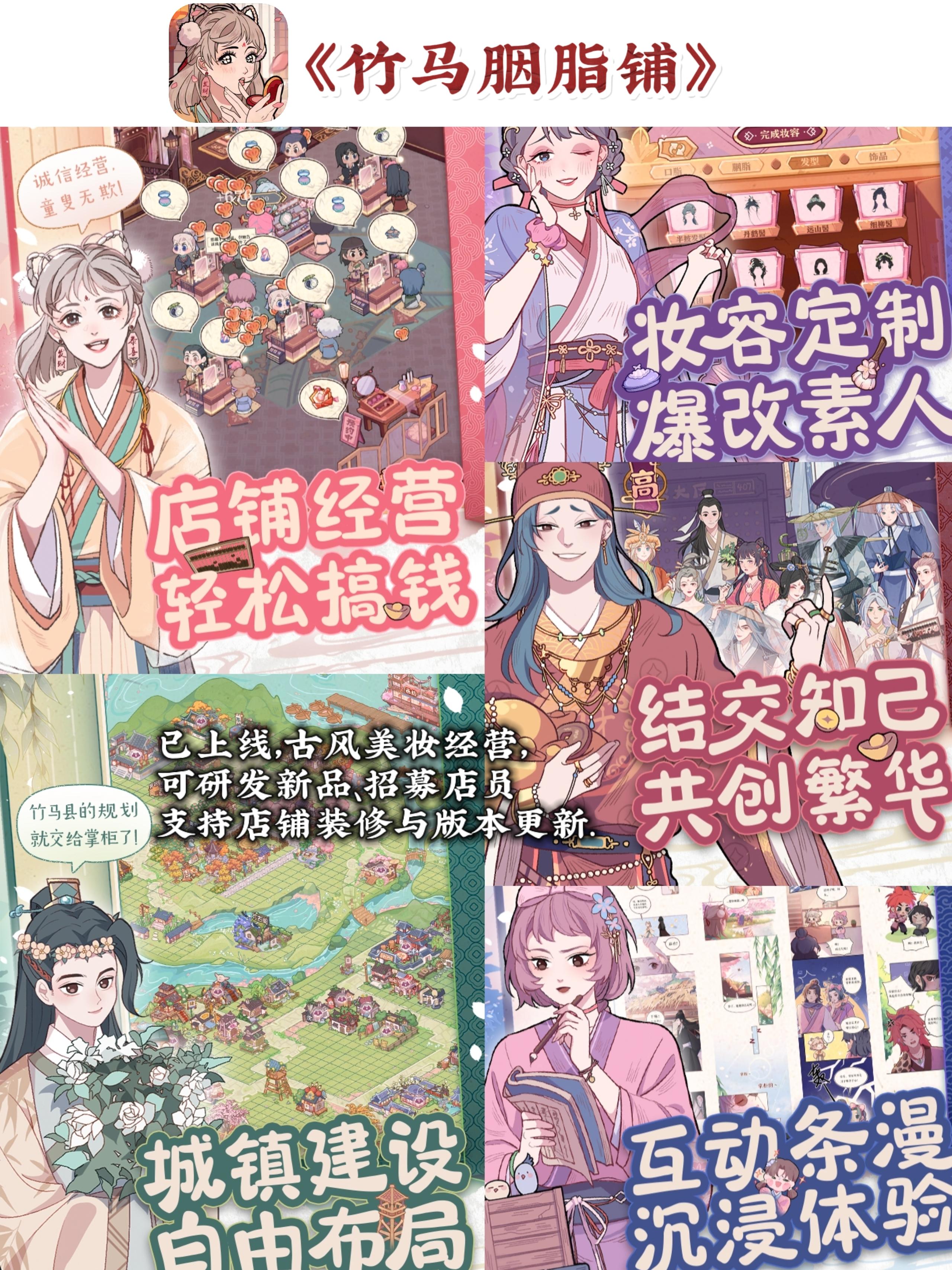 5.《竹马胭脂铺》(已上线):穿越古代搞美妆创业,研发新品、装修店铺、解锁漫画式剧情,打造专属美妆商业帝国。