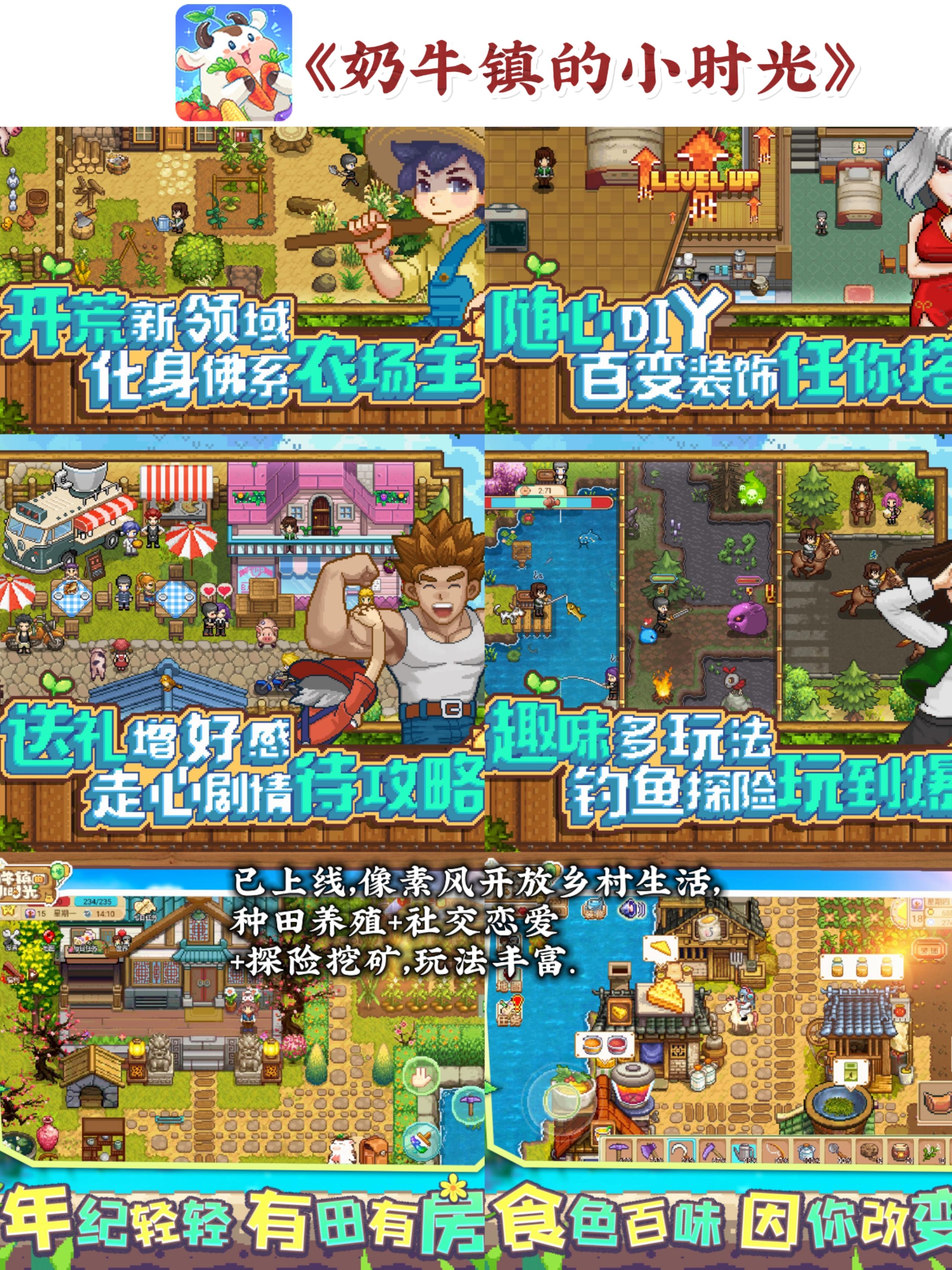 2.《奶牛镇的小时光》(已上线):像素画风勾勒鲜活乡村,种田养殖、社交恋爱、挖矿探险多线并行,自由解锁治愈系田园日常。