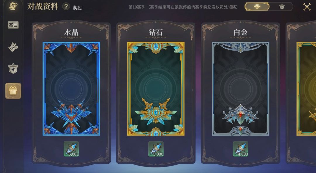 在水晶冲突段位赛中,每个段位都会有对应奖励,可以获得大量战利水晶和段位专属的肖像教材及铭牌装饰道具,让冒险者的强者风范,一眼便知: