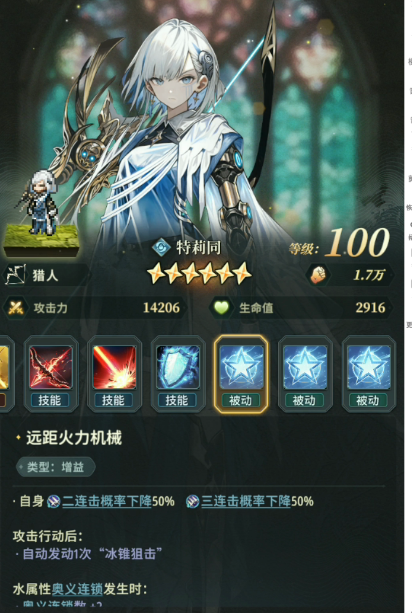 最后是水天机,1技能2倍水伤奥义回10%,生命回1000,2技能12倍水伤,1层冻伤(根据层数降低TA/DA)+减速,3技能消耗20生命掩护(替队友承伤)+奥义立即发动,奥义4.5倍水伤附加火伤减免100%配合掩护等于小无敌,被动虽然降低了TA/DA,但是每回合都能发动1技能回血回奥义,配合快速叠加冻伤的debuff可以快速触发7层立即发动3技能造成大量伤害。优先度:★★★