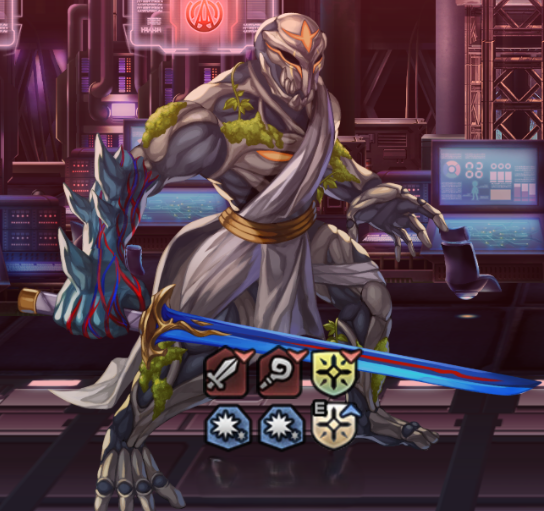 - 赋予自身物理耐性提升(中 / 2 回合)+ 魔法耐性提升(大 / 2 回合)+ 全攻击迎击状态(2 回合)+迎击:对敌方单体造成斩攻击 + 附加中毒状态( 1500 点固定生命值伤害)