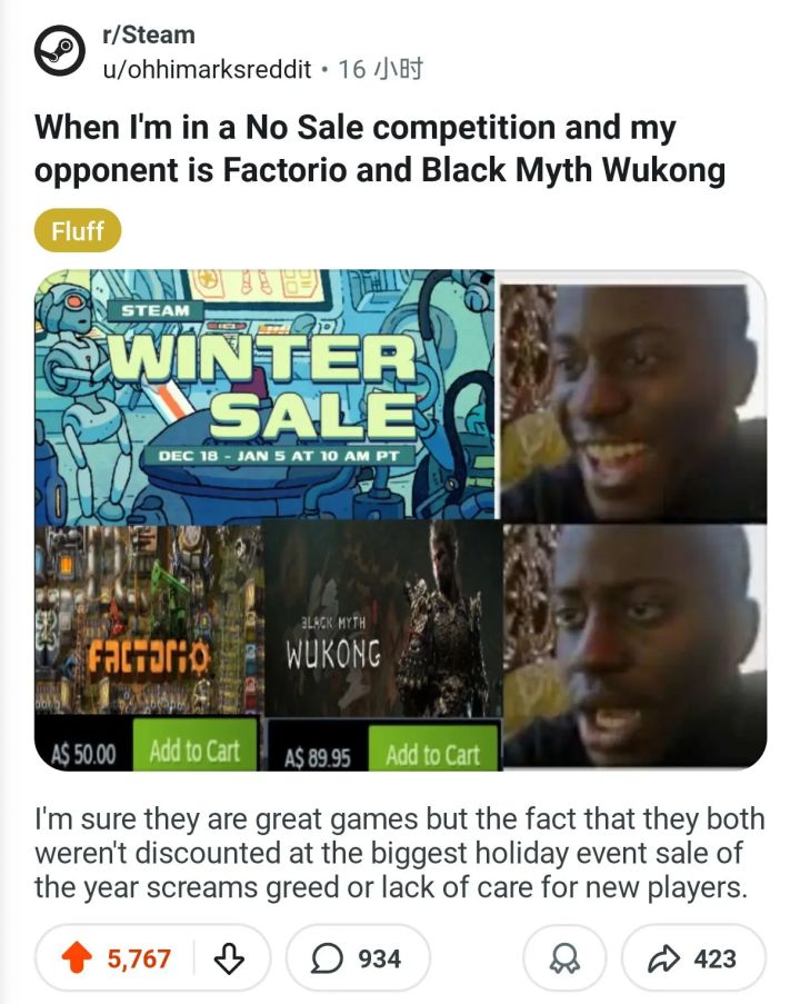 有外国网友发帖表示,为什么在一年中最大的折扣活动当中,黑神话悟空不打折,实在不理解!