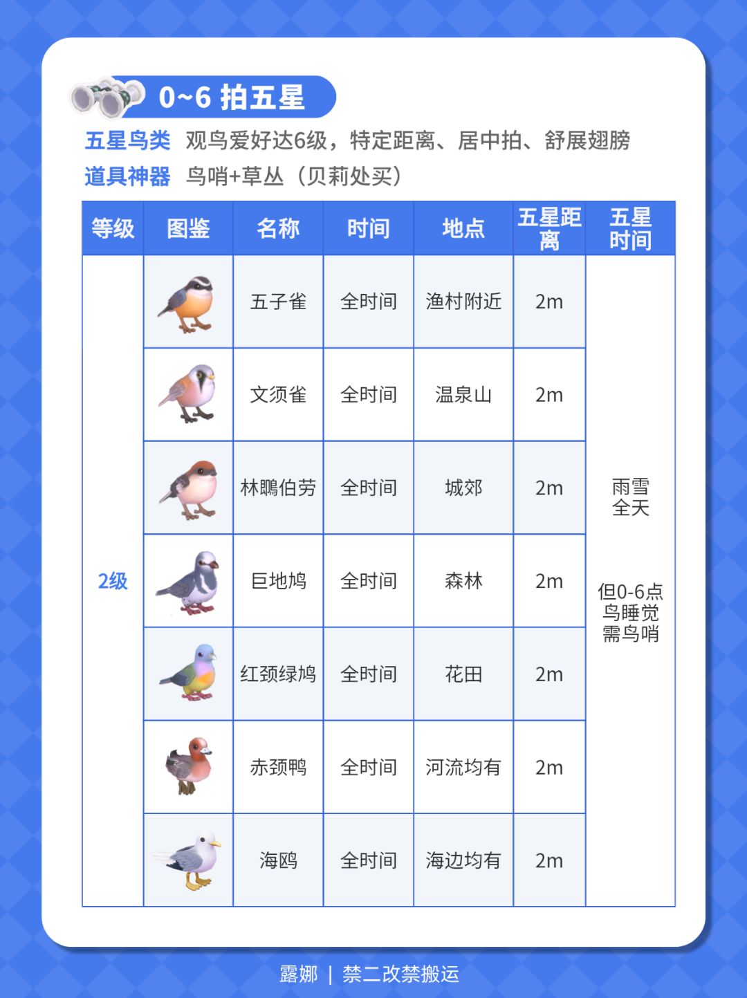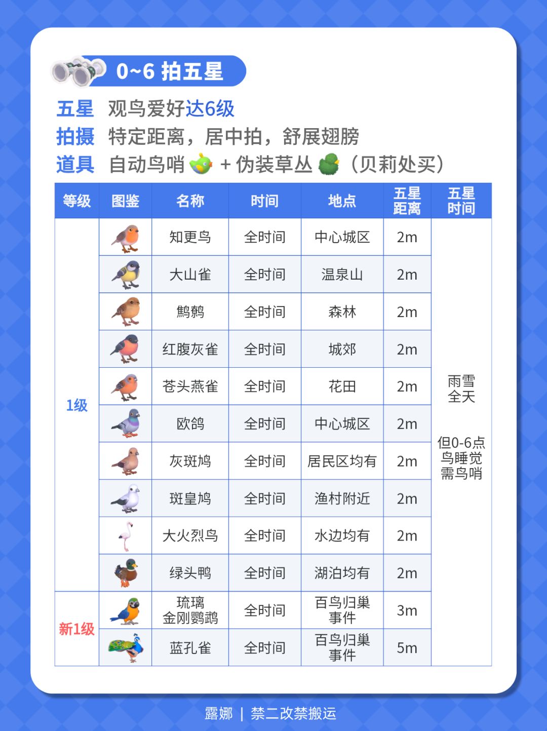 必做:①找朵朵买糖②常驻鸟拍5星③刷常驻图鉴