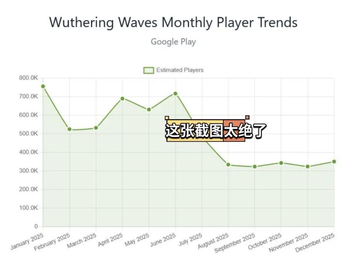 据第三方平台数据显示,鸣潮12月的活跃玩家人数为350.4K,相比11月增加了26.4K人数,涨幅8.1%