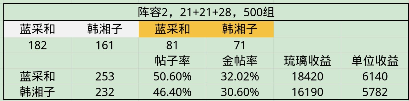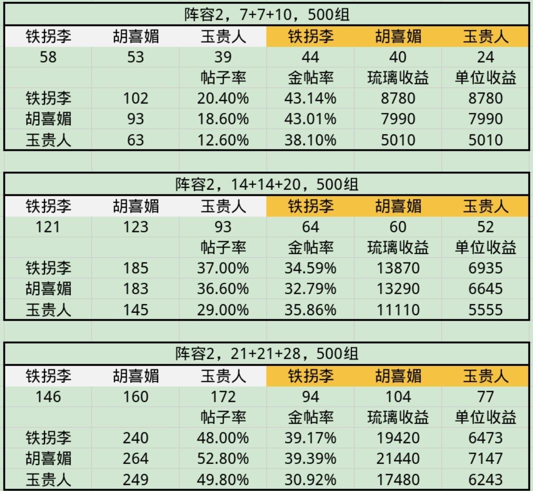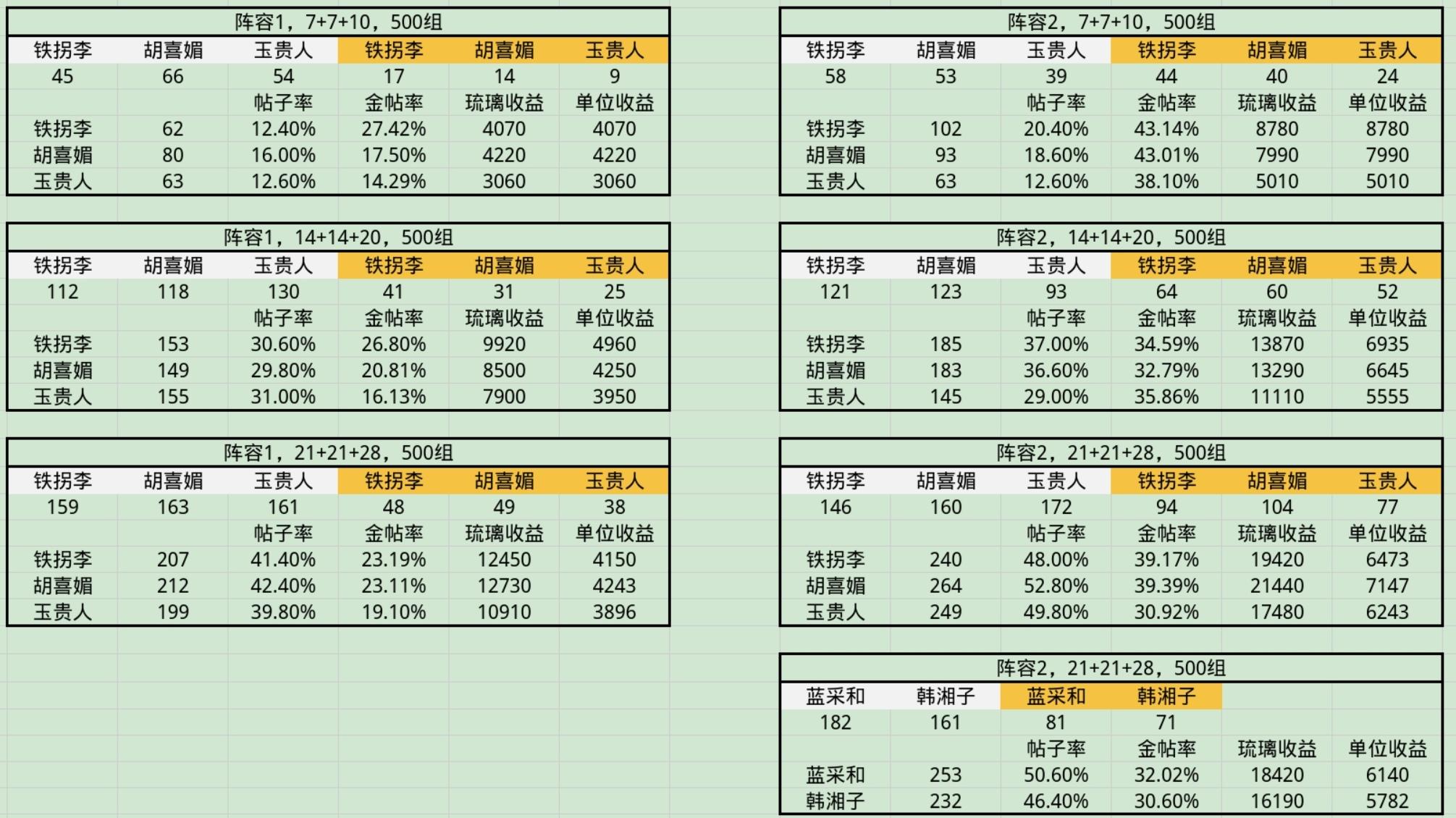 使用阵容2的相关测试数据,做了以下修正(主要是舍弃了7份的测试金帖率,因为贵客次数较少,故不是很准确)