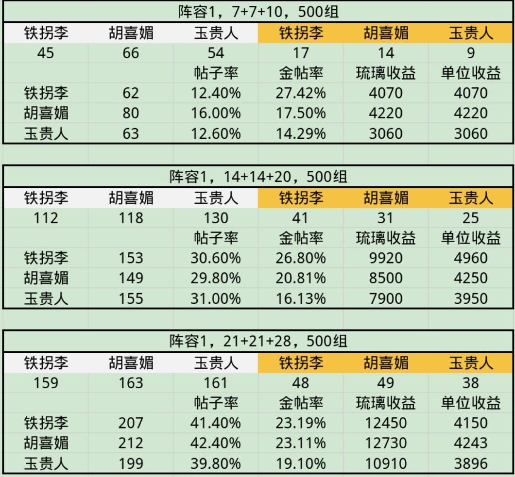 使用阵容1分别按照7+7+10,14+14+20,21+21+28的份数分别进行测试(可惜4火不能30份,不然正好3倍),简单整点,都来个500组: