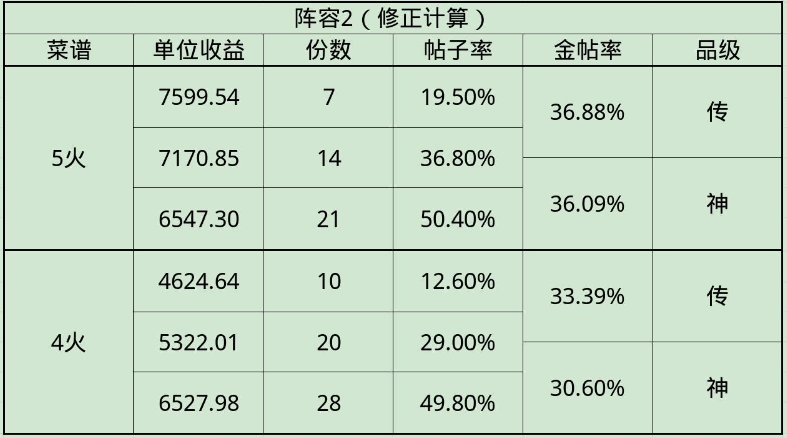 总结:追求效率的话,尽可能刷5火菜谱,品级神以上(特级也勉强可以),份数7份优先;4火菜谱作为次等选择,品级神以上,份数拉满。