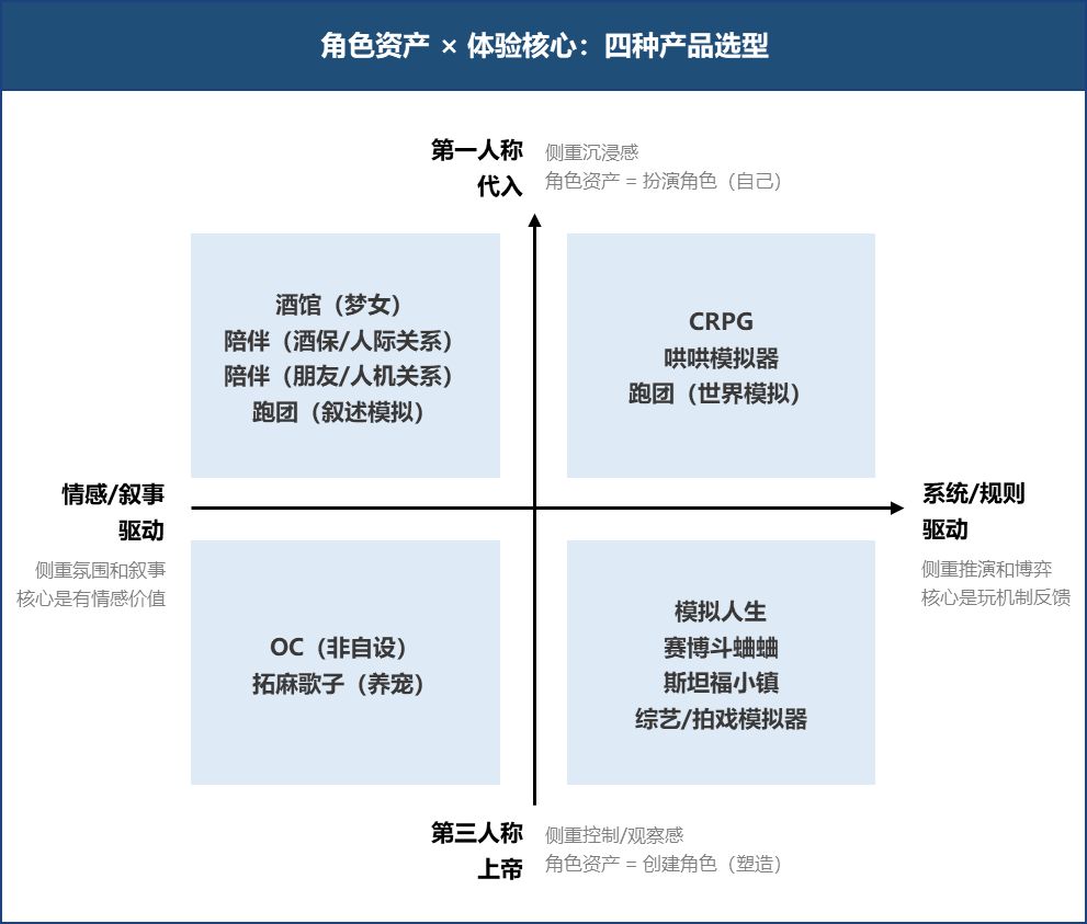 回顾目前看到的优秀案例,基本都是从创作爱好者切入,但不拘于原教旨主义群体,而是用AI能力将乐趣解构并扩散,以此锚定一批新用户。在这过程中,就角色资产和生成体验的选择差异划分出四个象限: