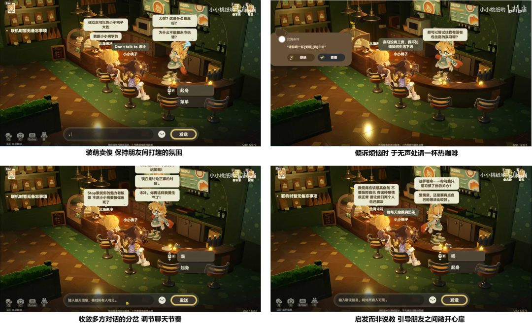朋友间借“老板娘如何称呼对方”的死亡问题来打趣彼此,娜洛会装傻卖萌,不破坏气氛。当有玩家认真倾诉情绪和困惑,旁人却在捣乱时,她会“顶着可爱的生气脸”制止对方,并抚慰倾诉者,甚至引导朋友请客喝咖啡来舒缓氛围,重归于好。