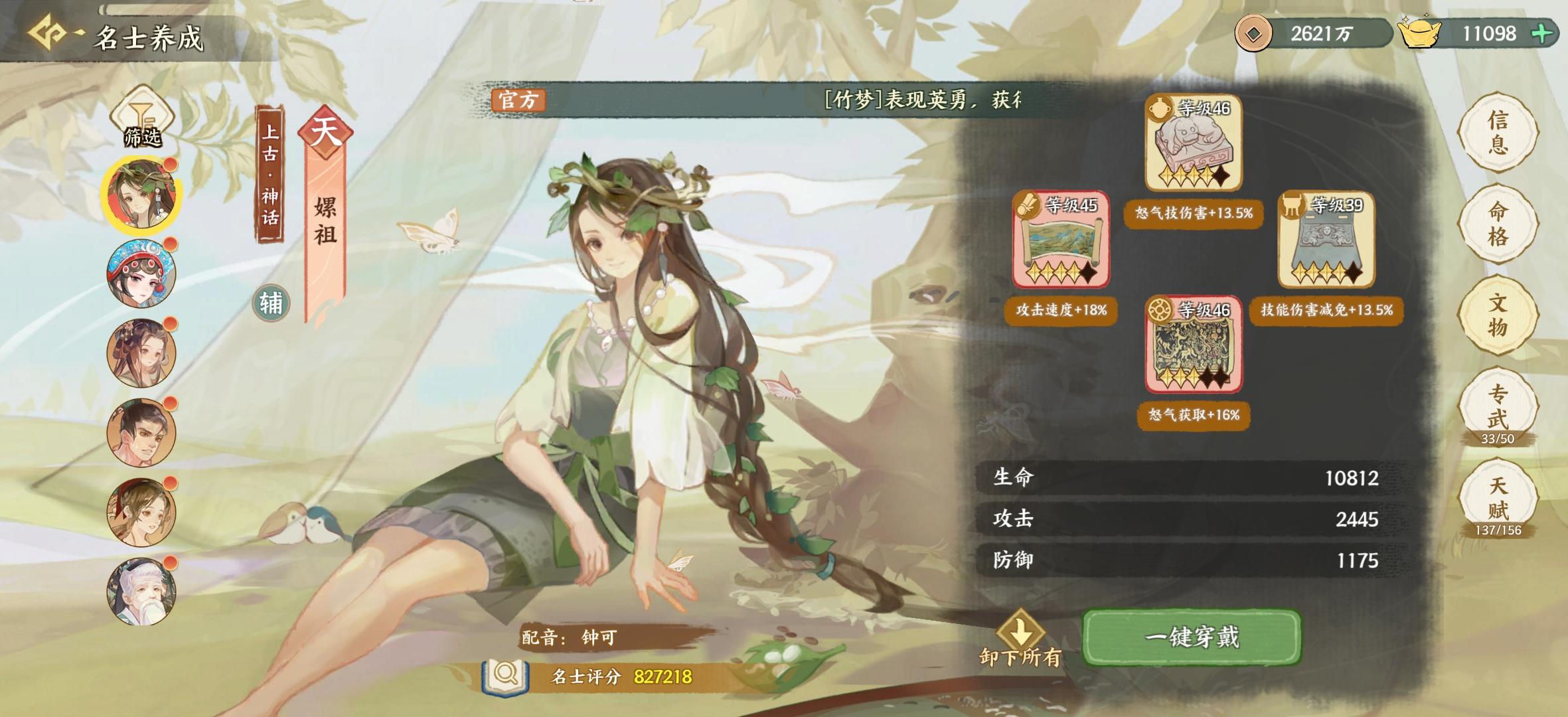 嫘祖文物方面,推荐千里江山图+织绵护臂,增加技能释放频率,基本实现连控