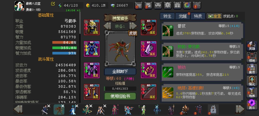 6转,提升很大,但忘了测6转前的数据,就测一下6转点左右两边的区别反推一下,目前未点6转的特质加强,就是为了纯粹测一下数据,采用金觉醒,连爆的配置