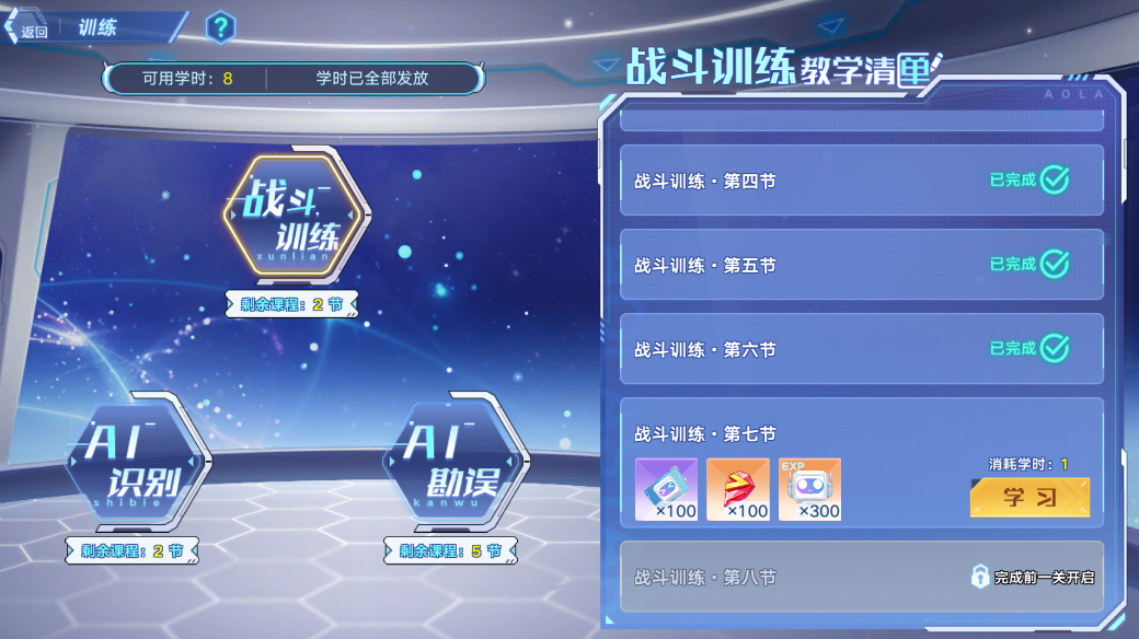 1.1月8日更新后开启战斗训练·第七节和第八节、AI识别·第七节和第八节、AI勘误·第七节和第八节;