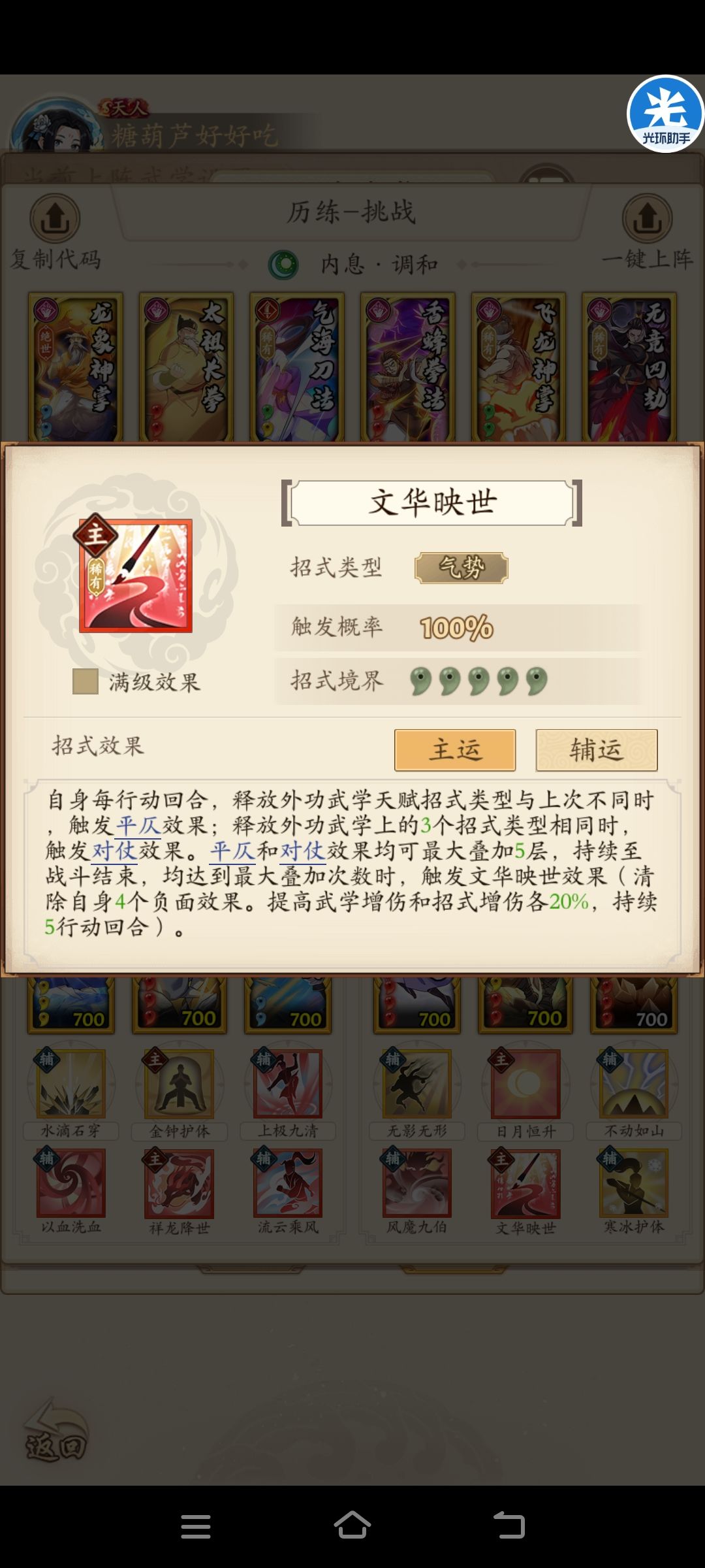 文华:按上面说的,最快六号位吃满效果触发文华,触发完,五回合招式和武学20增伤,这里持续到第二轮4号位,那也就是十回合后没有文华效果
