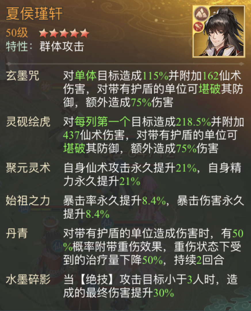 夏侯瑾轩放4号位,夏侯瑾轩放这里配合同列伙伴可全程持续对敌方柳梦璃造成伤害(柳梦璃精力多,收益最大化),在第3回合时,绝技“灵砚绘虎”对敌方每列第一个目标造成高额伤害,绝技若暴击,则会提高三分之二的伤害,有效提高总分值。