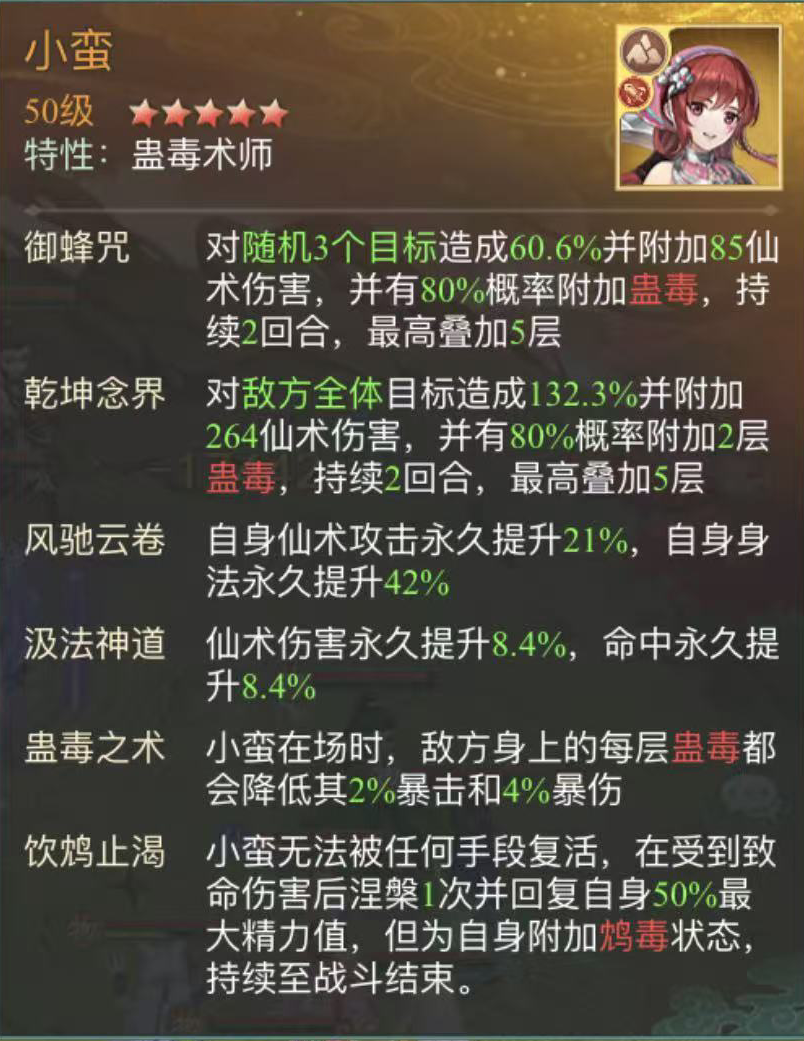 小蛮放3号位,小蛮普攻“御峰咒”对场上随机3个目前造成法术伤害,有80%概率附加蛊毒,绝技“乾坤念界”对全体目前造成法术伤害的同时一样有80%概率附加蛊毒,最高叠加5层,被动“蛊毒之术”使中毒者每层降低2%暴击和4%爆伤,提高伙伴生存,另一被动“饮鸩止渴”受到致命伤害后涅槃1次,回复自身50%精力,因此充当右侧前排,且在第三回合时,因自身可以涅槃1次,配合伙伴王蓬絮触发被动“朱仙变”使王蓬絮获得30%仙术伤害提升。