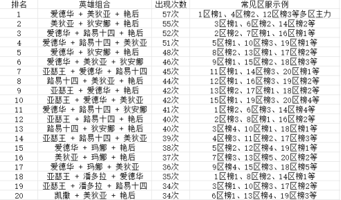 重要发现,爱德华出现在前10的所有3人组合中,堪称“版本真神”。而“爱德华+美狄亚+艳后”这个铁三角,在57支队伍中出现,是当之无愧的第一组合。