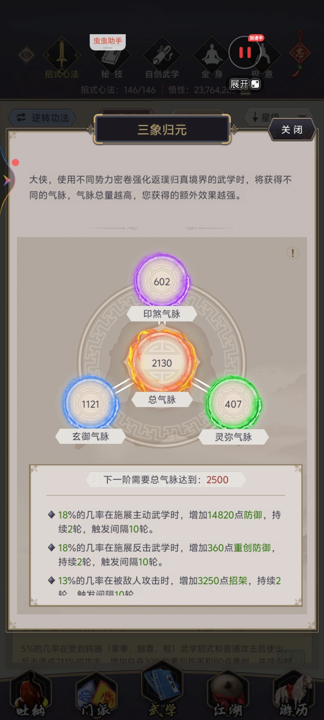 因为三象归元不同会因为不同的气脉数量产生不同的效果(后面简称:气脉共鸣)