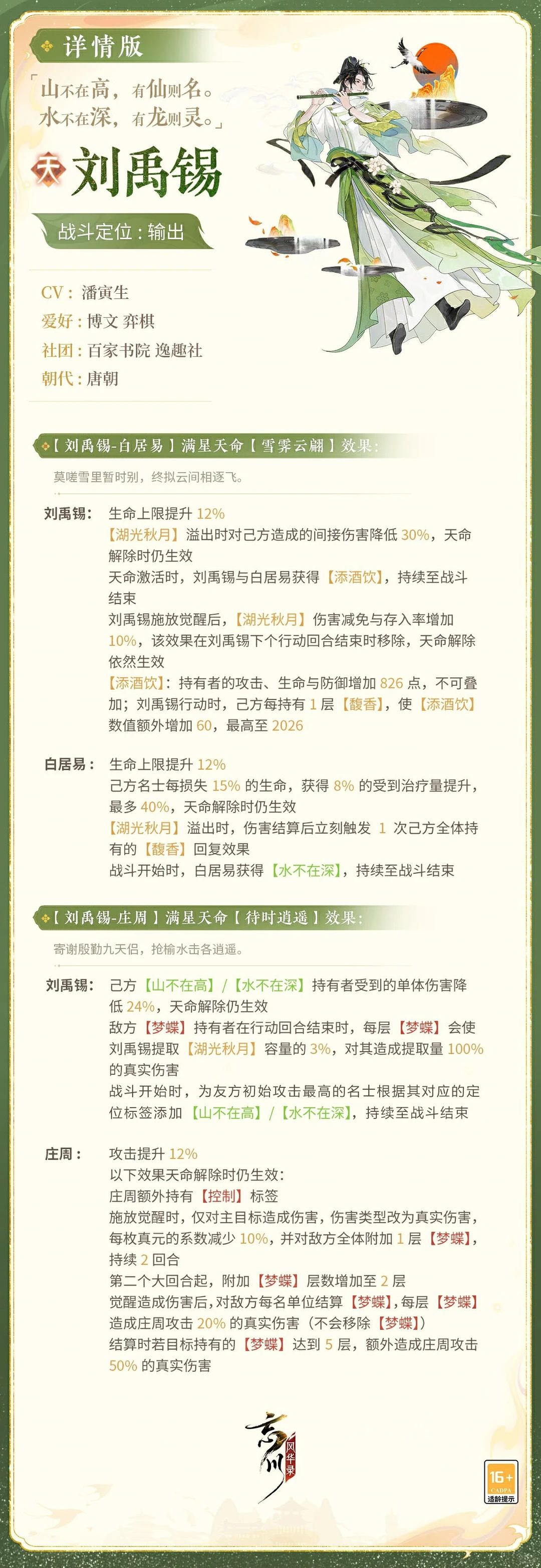 在忘川中,刘禹锡将作为输出名士登场,使君大人可点击下图,细品梦得诗镌傲骨,笔写千秋的风采!小麒麟抱来了详细的刘禹锡技能,使君大人快来看看吧!具体技能效果以上线实装为准哦~