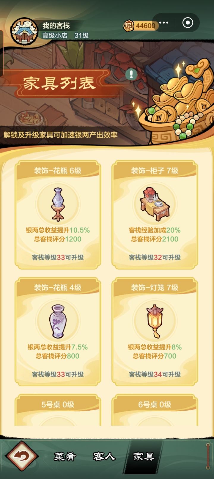 什么破游戏,不继续充钱,就不让玩了,客栈评分卡在44600就不涨了,家具升完了都没用,问客服还不给解决。