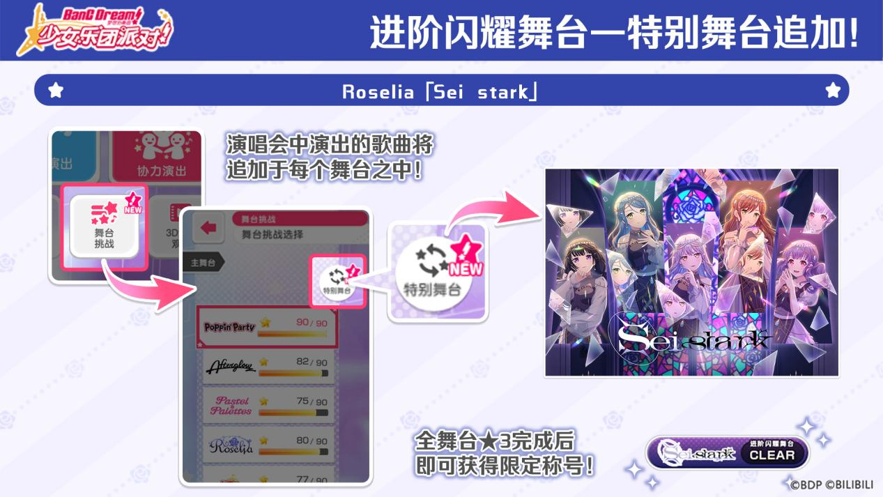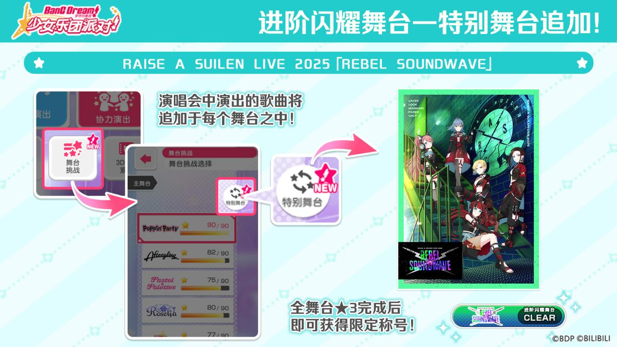 进阶闪耀舞台将于1月9日维护后开启特别舞台RAISE A SUILEN LIVE 2025「REBEL SOUNDWAVE」、Roselia「Sei stark」!完成全舞台★3演出,即可获得RAISE A SUILEN LIVE 2025「REBEL SOUNDWAVE」、Roselia「Sei stark」开展纪念称号,大家一起来尝试挑战吧~