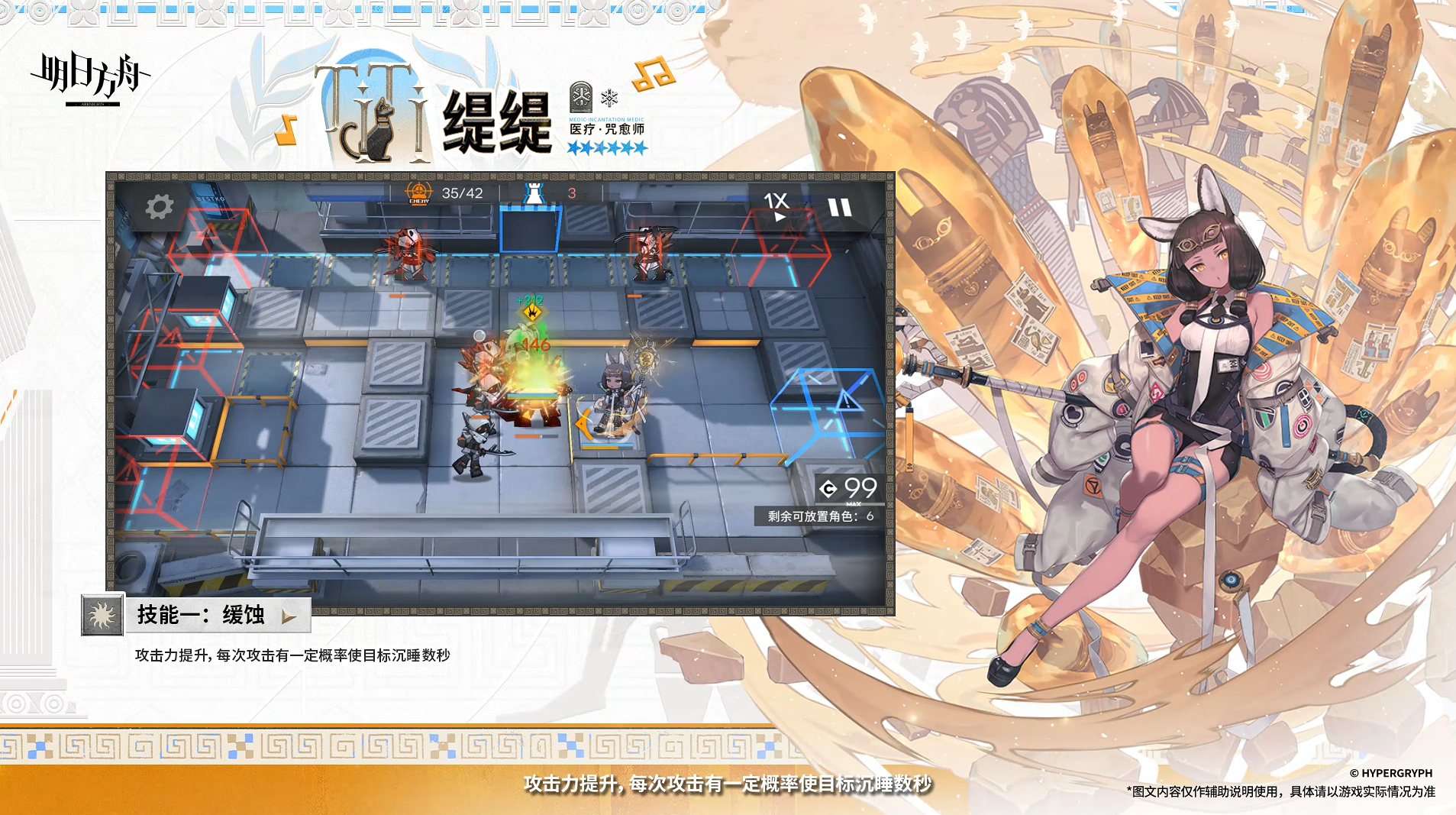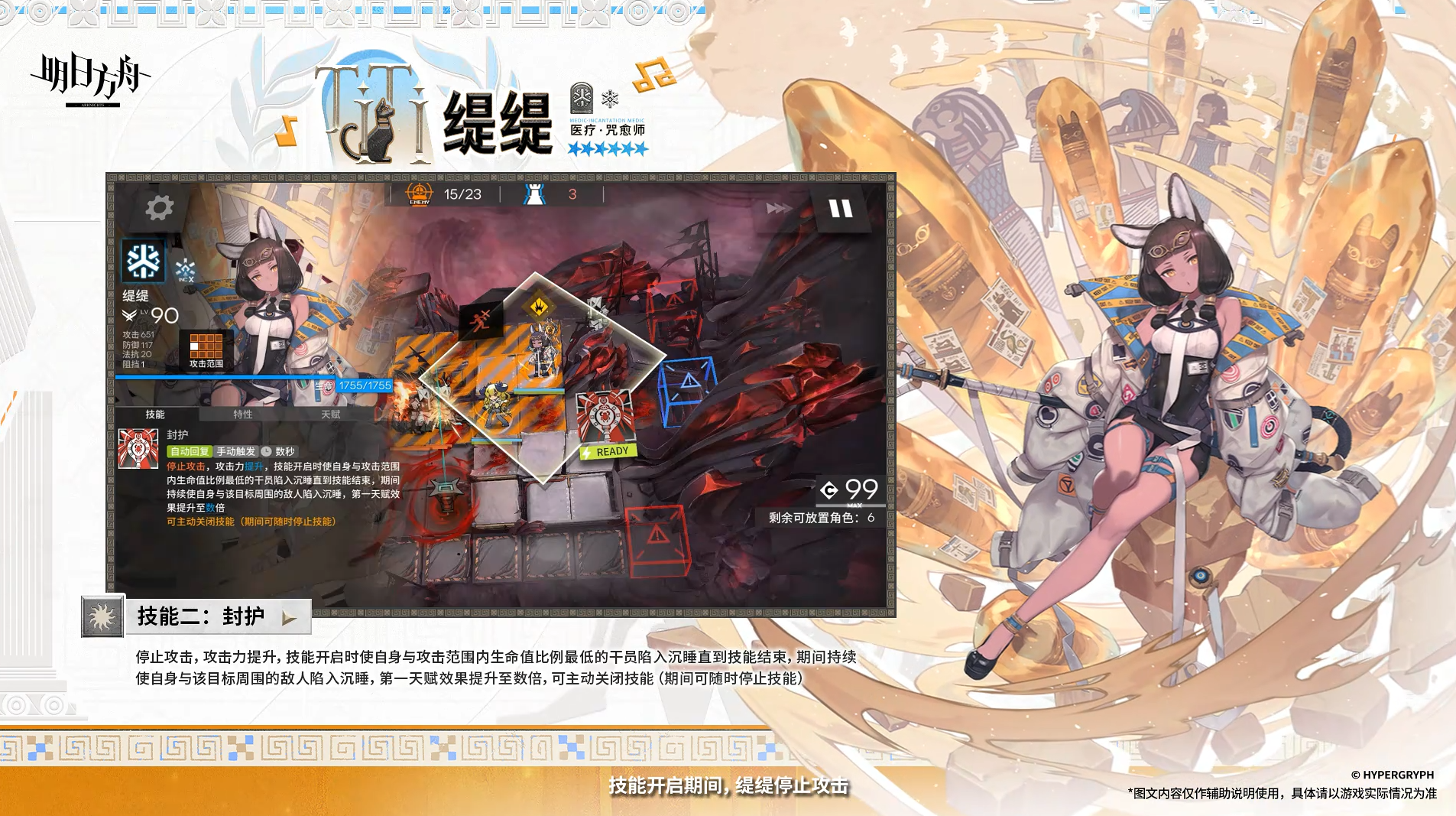 自身可以攻击沉睡的敌人,且攻击非移动敌人时对其额外造成相当于攻击力一定比例的法术伤害,在场时沉睡中的敌人每秒受到缇缇攻击力一定比例的法术伤害