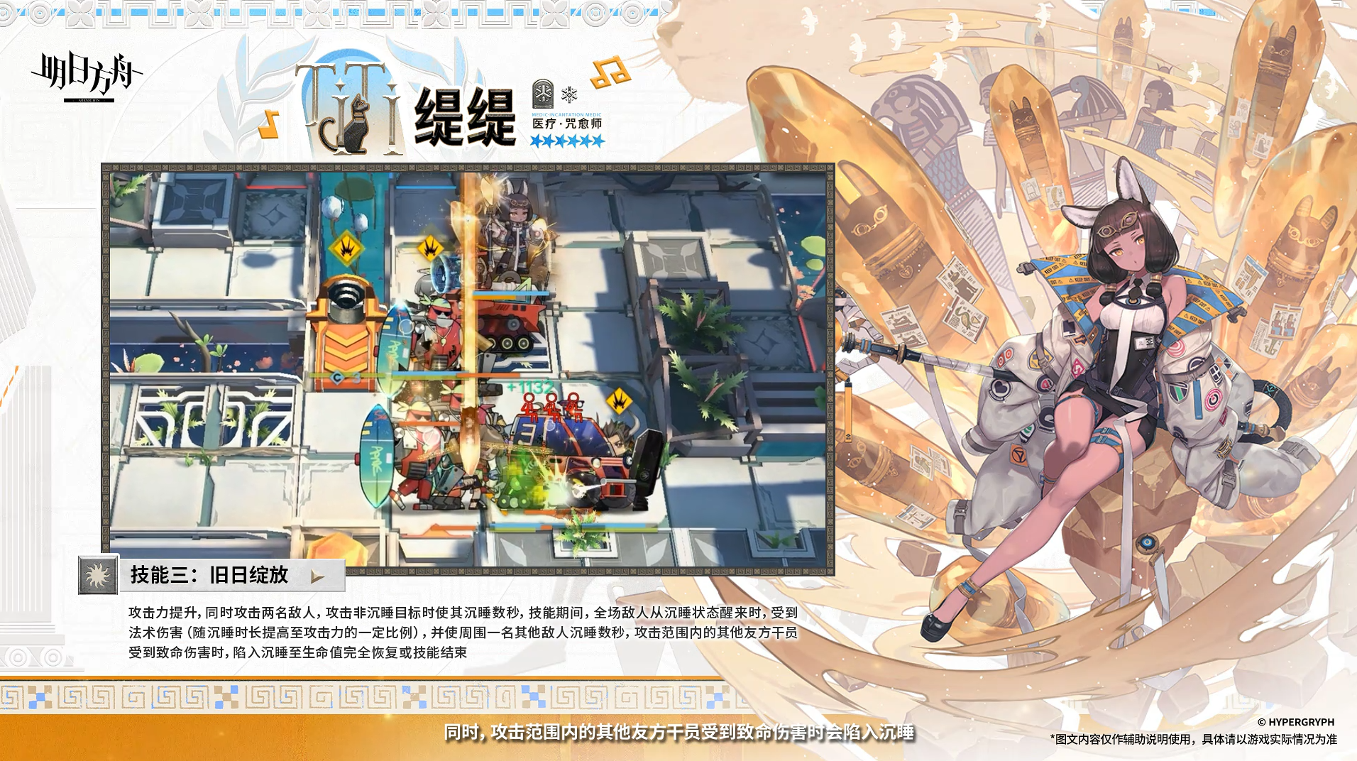 攻击力提升,同时攻击两名敌人,攻击非沉睡目标时使其沉睡数秒,技能期间,全场敌人从沉睡状态醒来时,受到法术伤害(随沉睡时长提高至攻击力的一定比例),并使周围一名其他敌人沉睡数秒,攻击范围内的其他友方干员受到致命伤害时,陷入沉睡至生命值完全恢复或技能结束