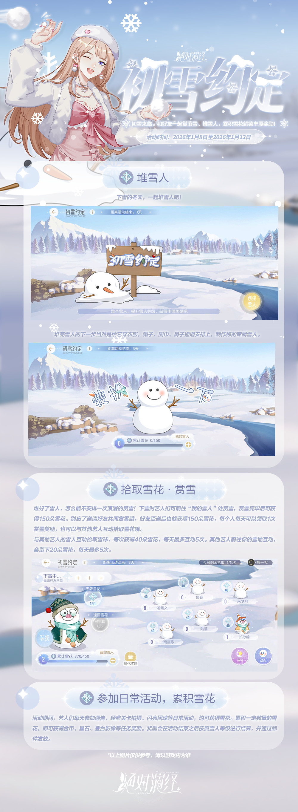 不仅可以堆雪人,还可以按照你的喜好装扮出属于你自己的雪人,今年大家想要给雪人穿上什么衣服呢?1月8日(本周四),“初雪约定”活动上线,和女明星最重要的TA一起收集雪花,兑换丰厚的奖励,就让漫天雪花为年初的时光献礼吧!