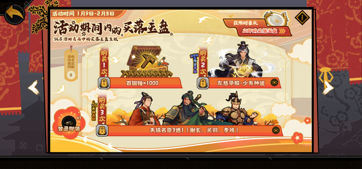 1月9日至2月5日,落玉礼赠活动限时开启!活动期间内购买指定次数的落玉盘即可领取百锻锤、左慈华服、天级名臣3选1礼包等超值奖励,助力名臣养成与装扮收集!