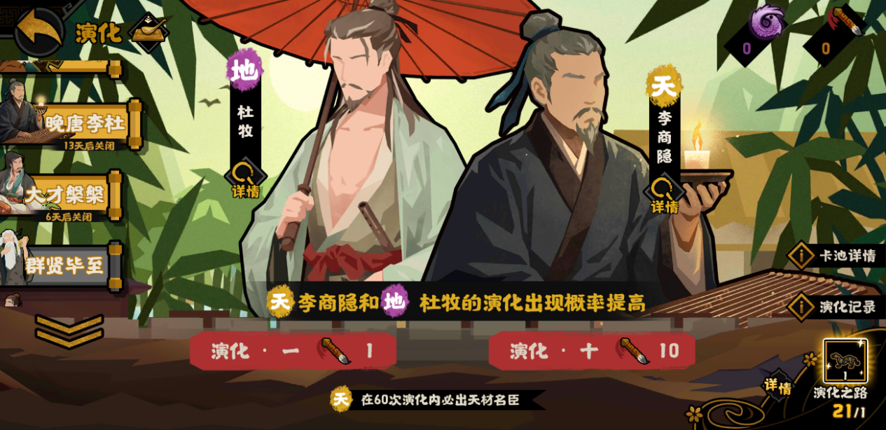1月9日至1月22日,晚唐名臣“小李杜”——李商隐、杜牧演化概率限时上升!